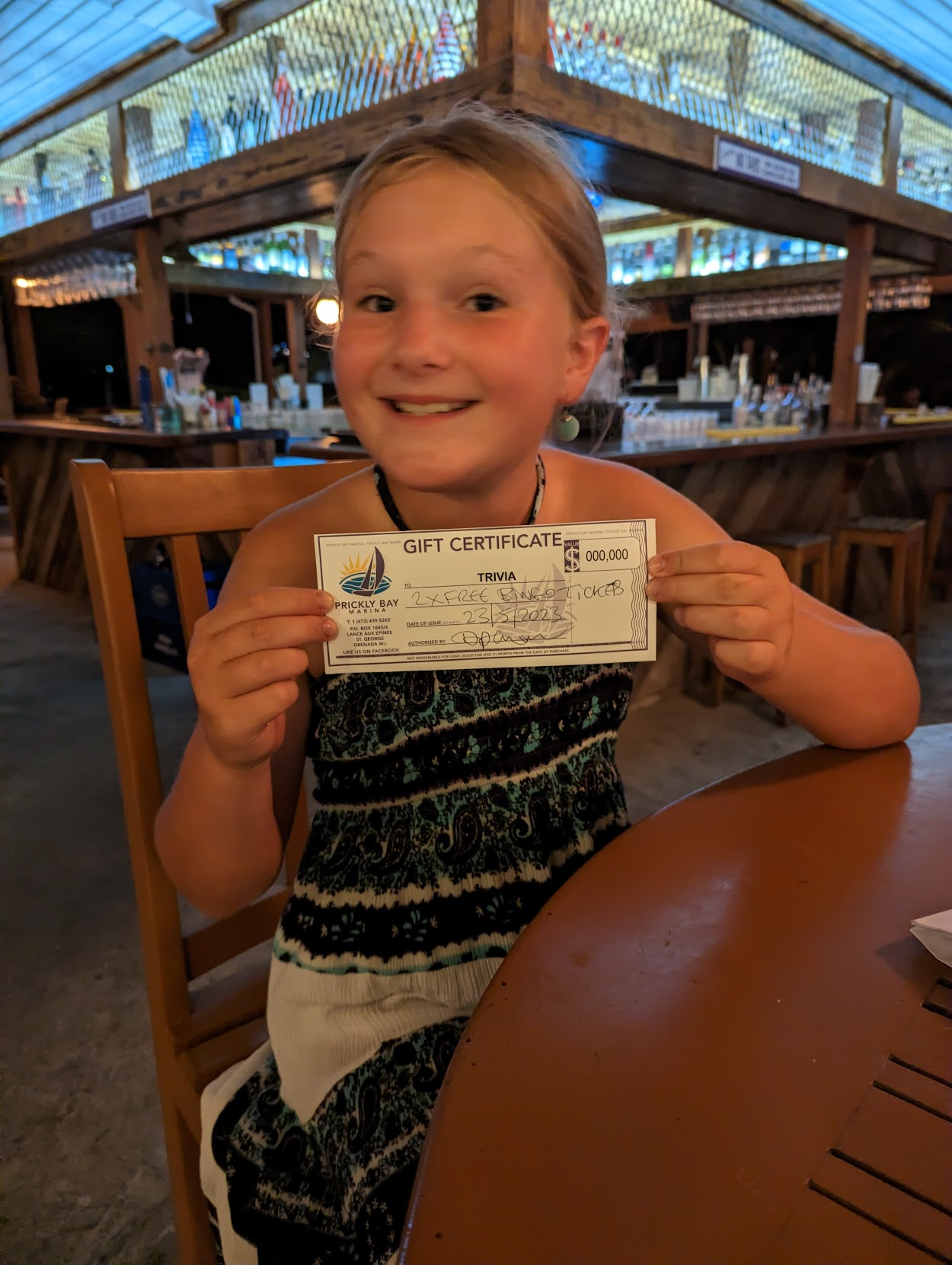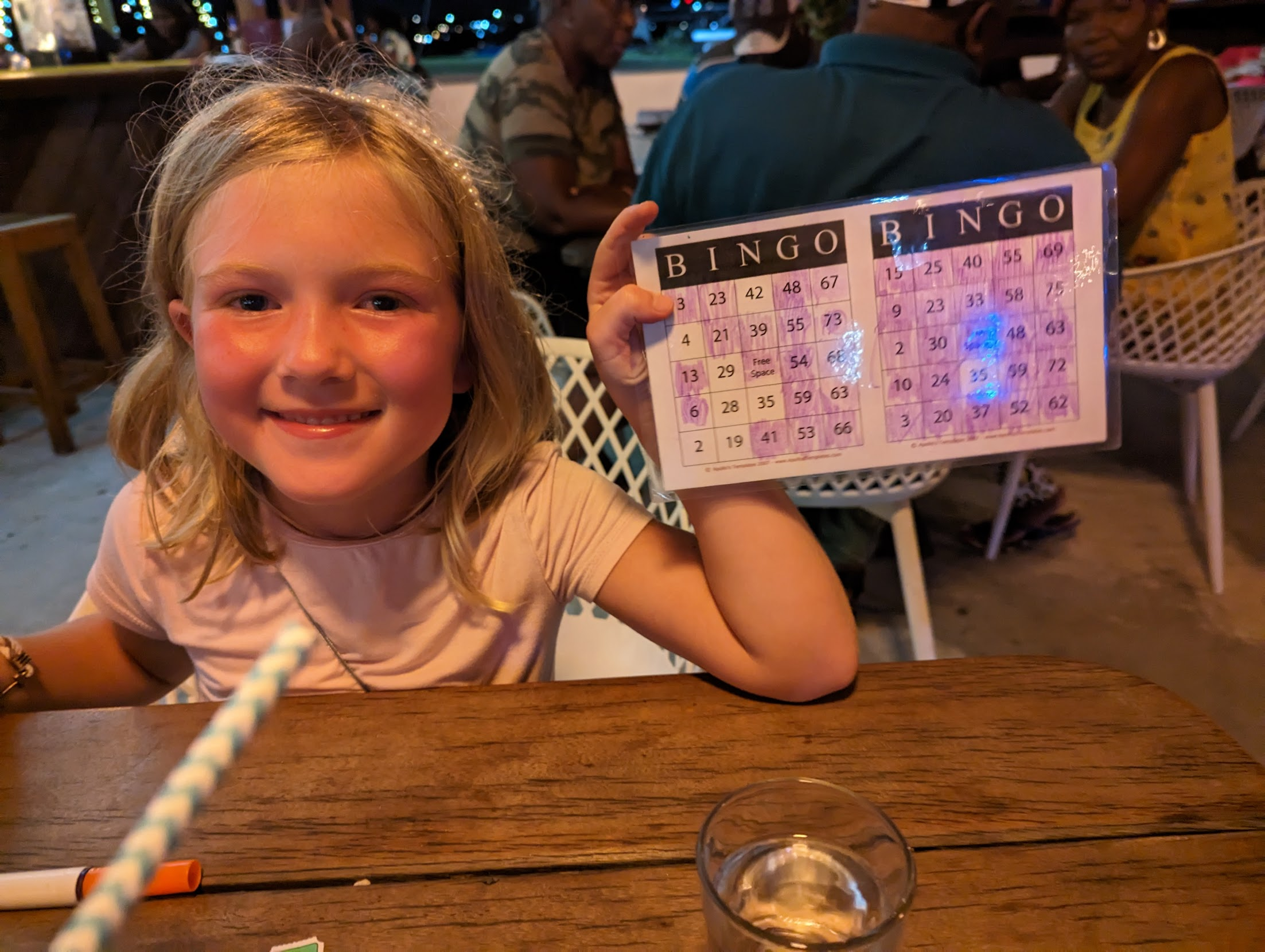 Last night we went to one of the other marina restaurants for dinner. Turns out Tuesday is trivia night. The girls really wanted to play... and surprisingly they are pretty good at it. Fun fact - Olivia named our trivia team "Diamonds Never Shine Their Shoes". We actually didn't do that bad even though all the other teams had way more adults than ours. Since our team was the only one with kids the guy gave us a prize too - two free bingo tickets to tonight's bingo at the same restaurant.
