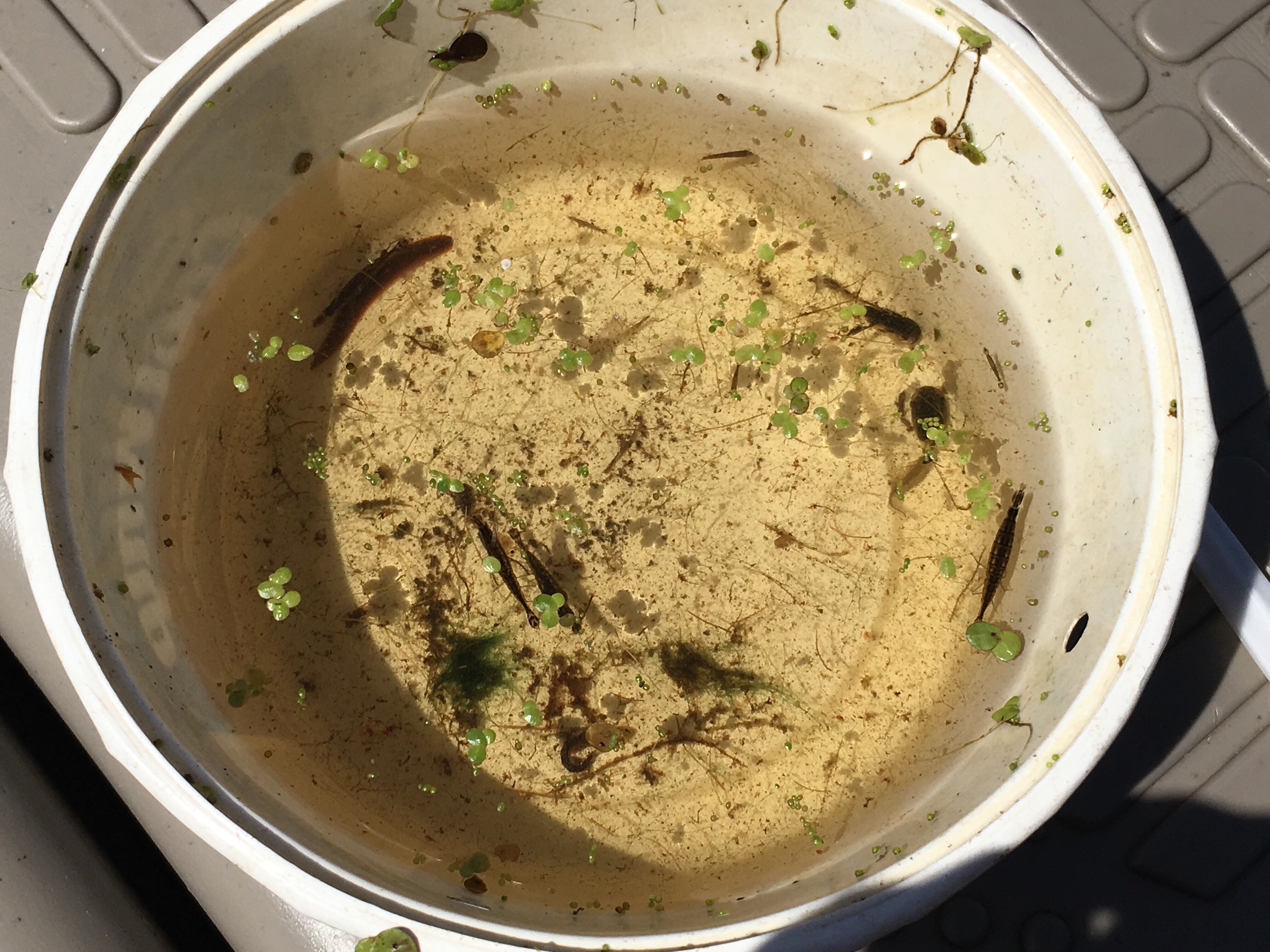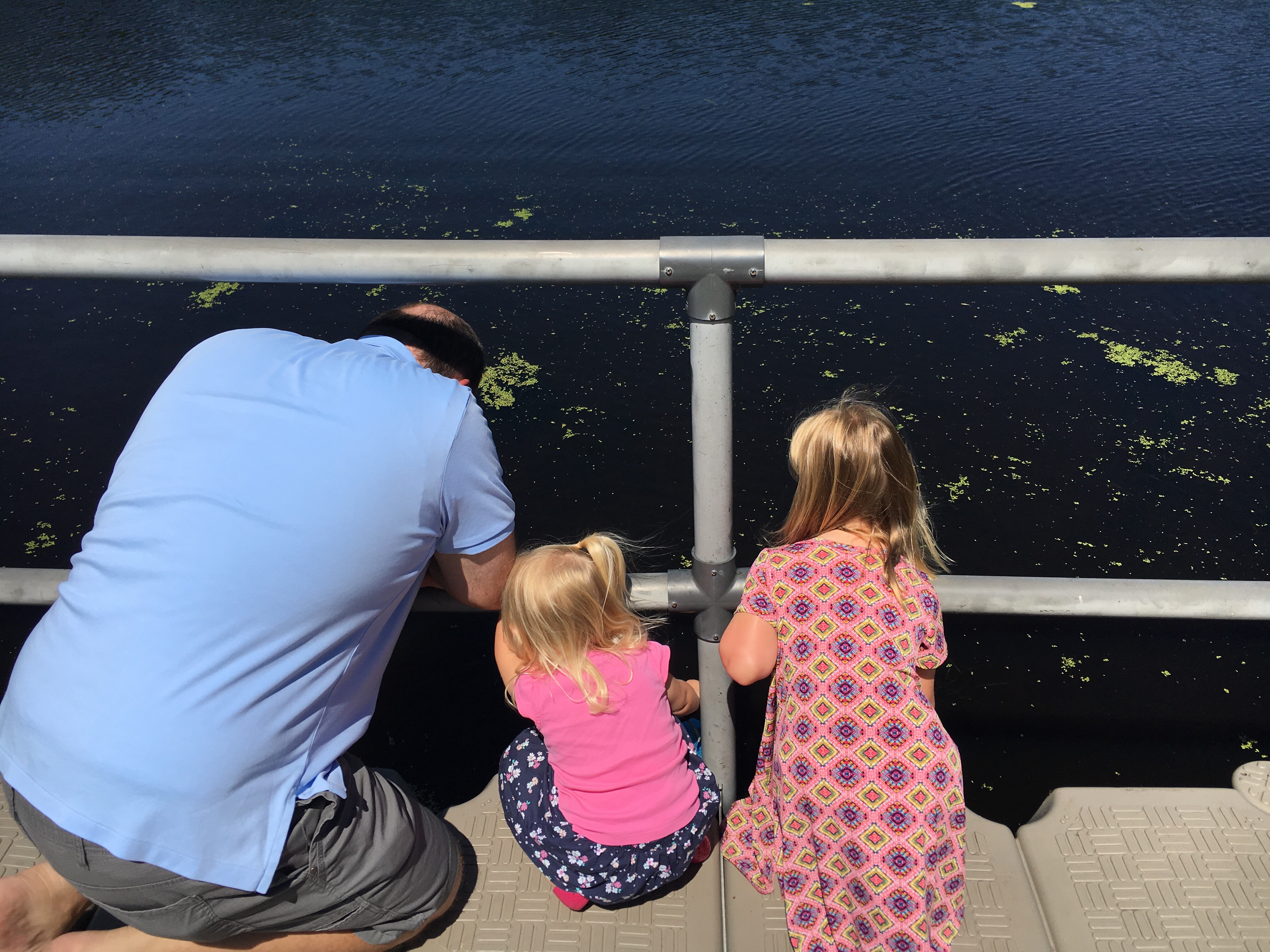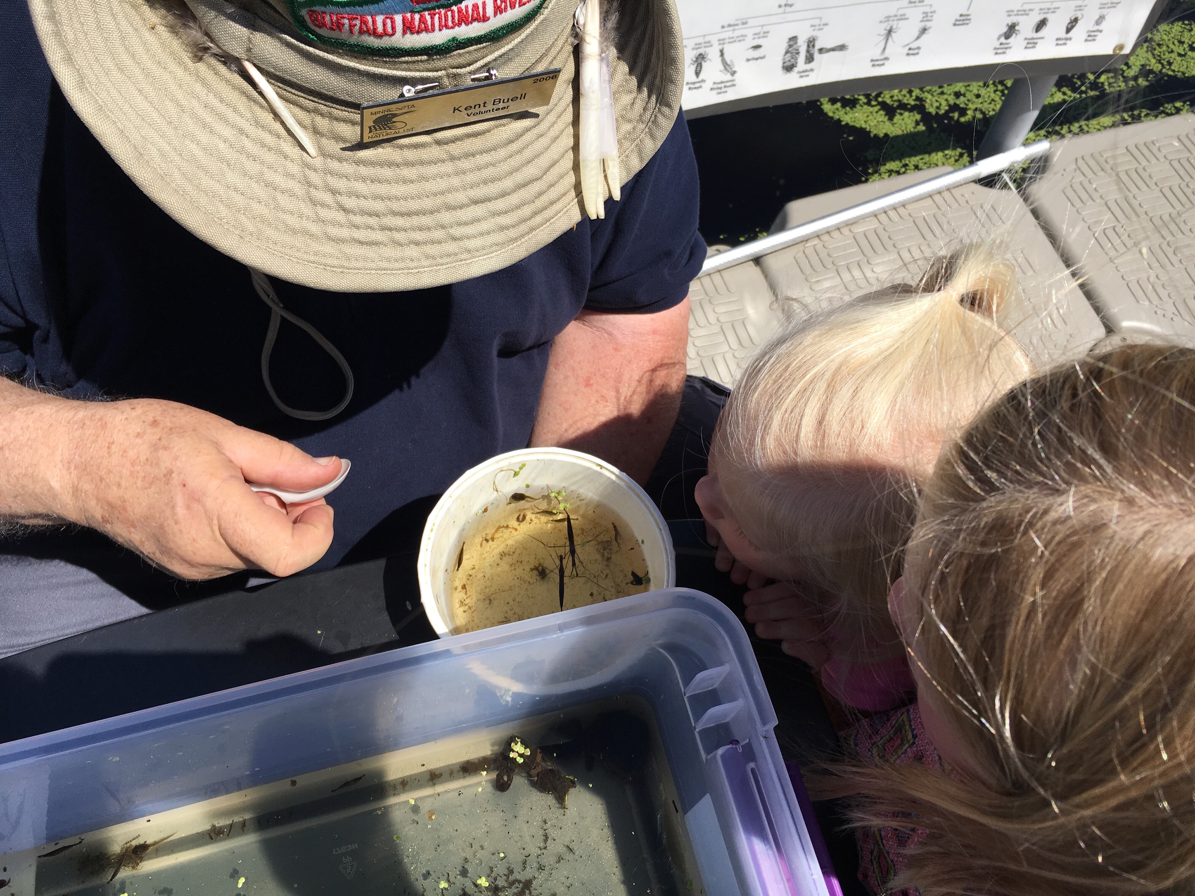 The guy explaining to the girls all the stuff they found in the pond.