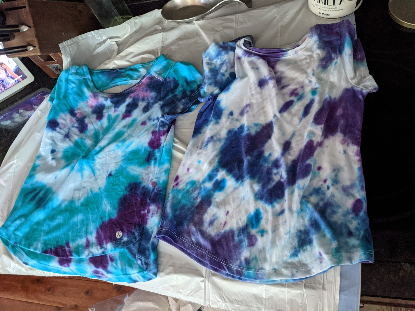 The tie dye had to soak over night, so Emma woke me up this morning ready to rinse and wash all her creations. They came out way better than I thought they would!