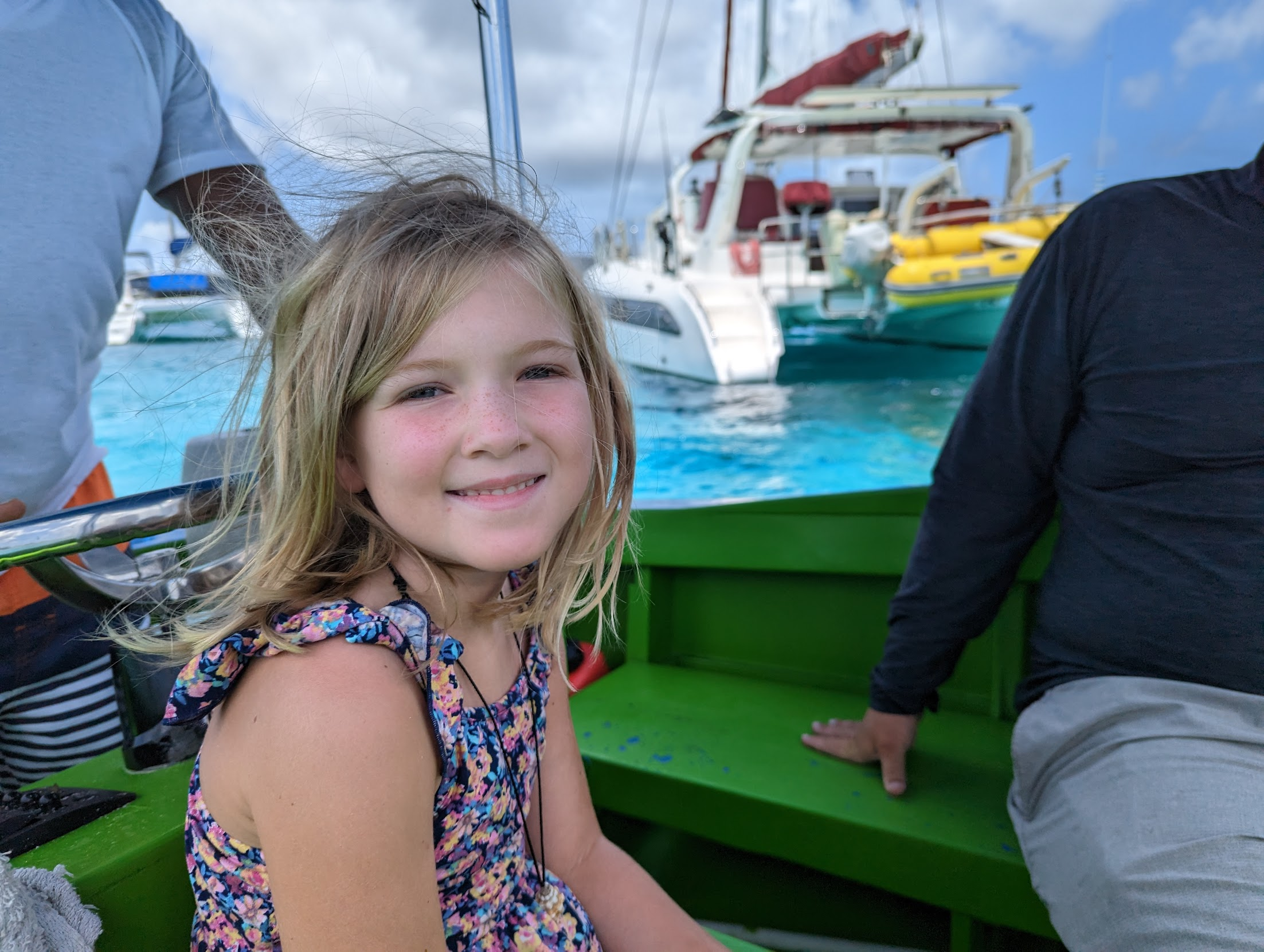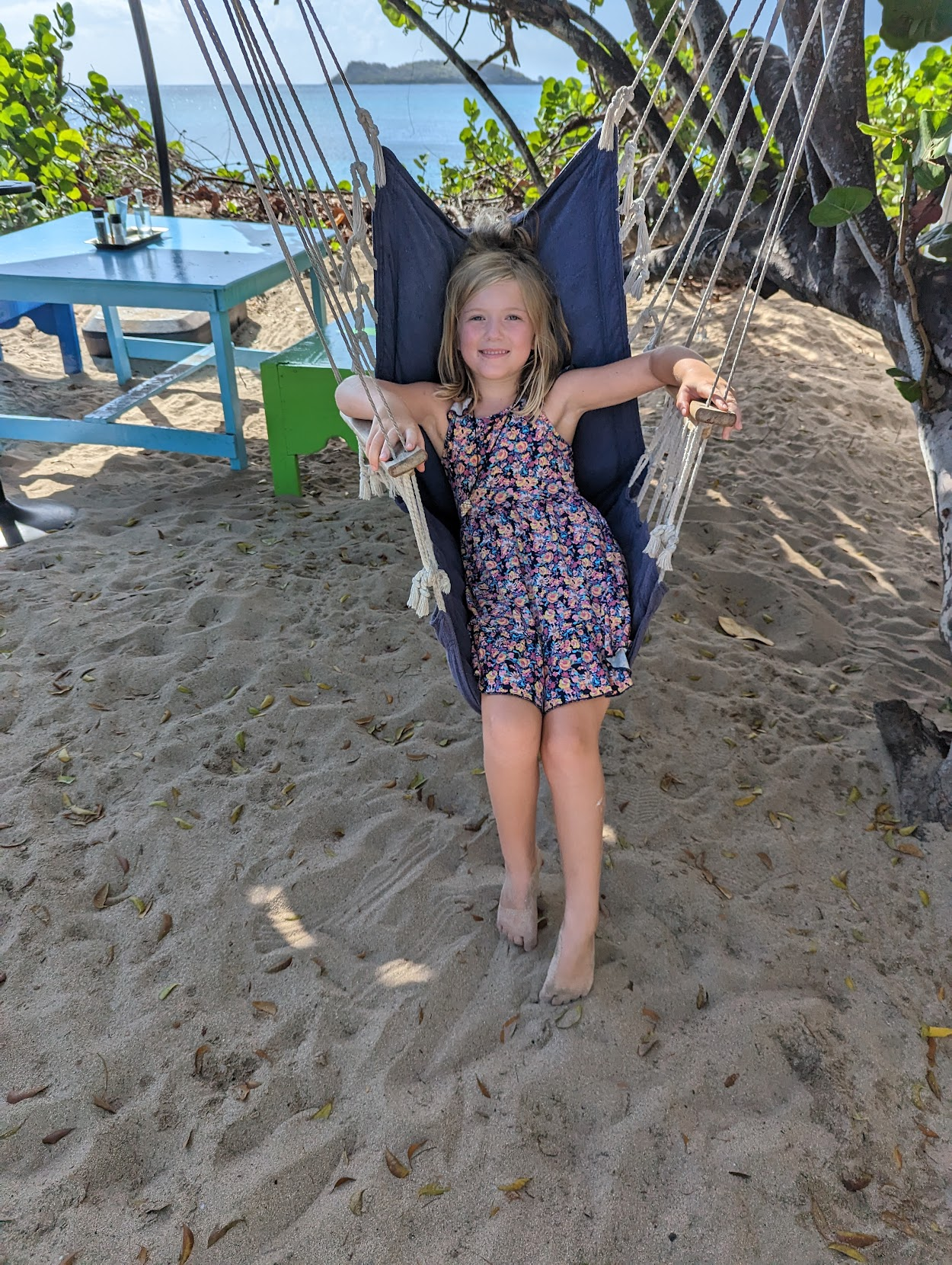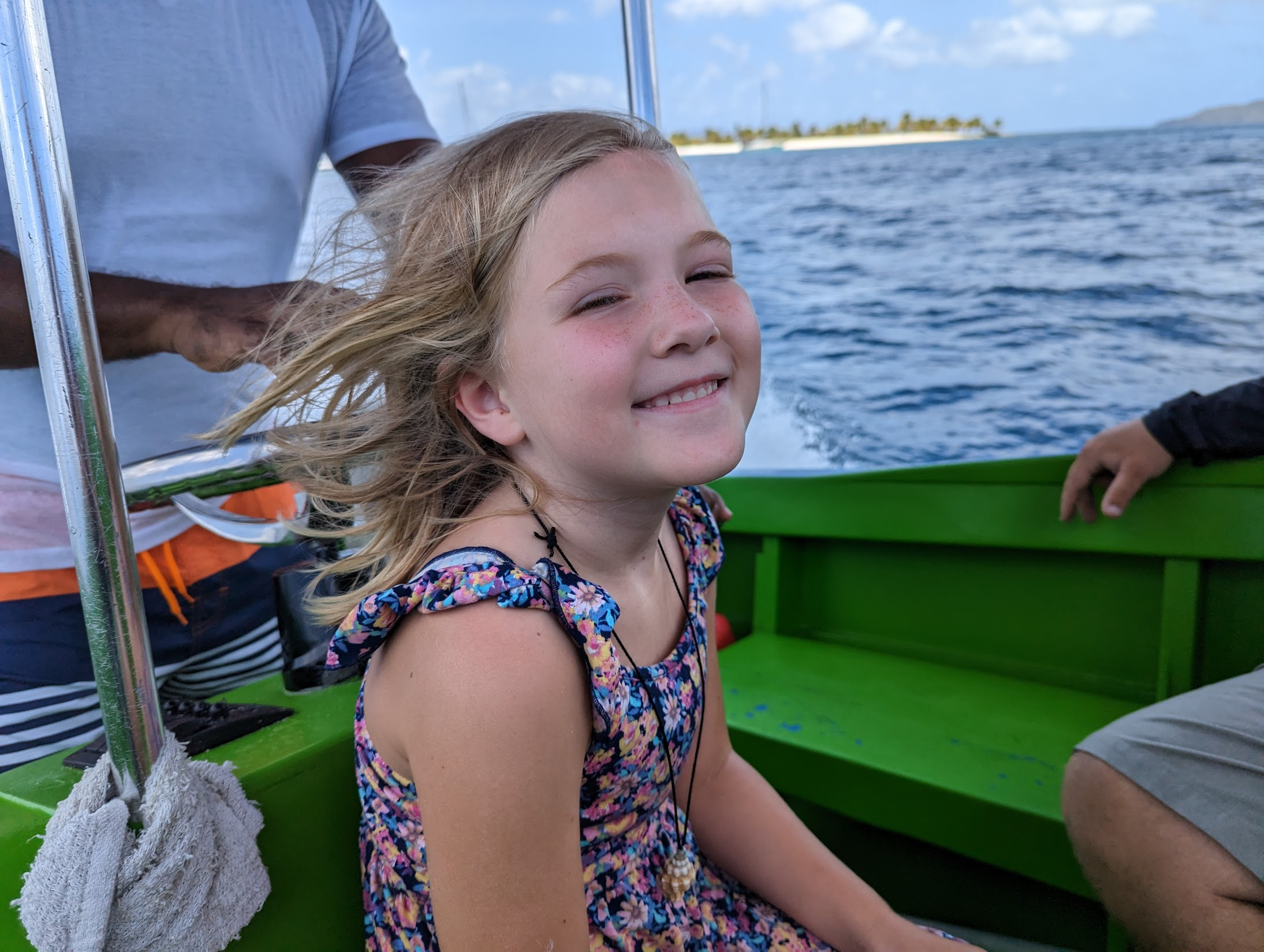 A couple hours later and we were back in Carriacou. This might be one of Olivia's favorite things... the taxi ride from our boat to the beachside restaurant. The boat goes so fast, and she loves it.