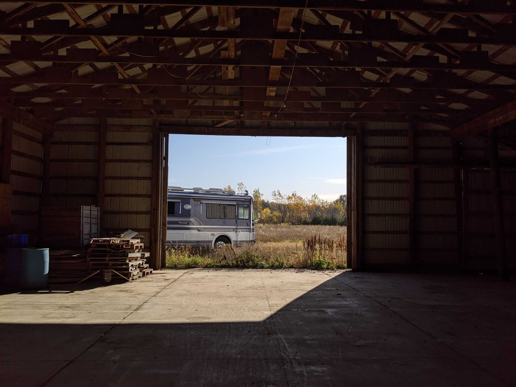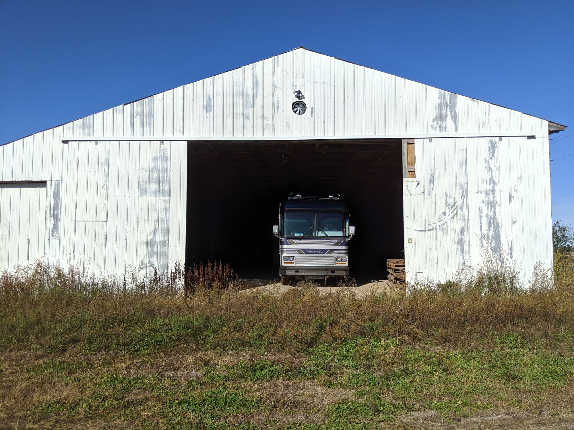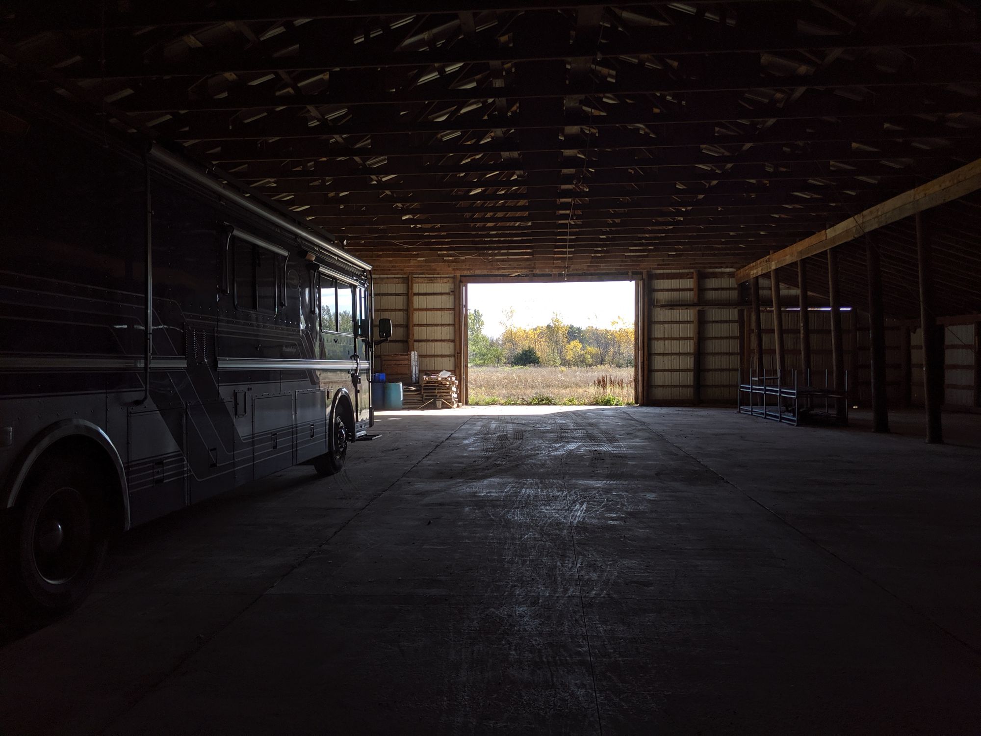 We recently bought a barn... on 5 acres. Every winter we move our bus to some guys barn and pay him a lot of money to store it for the winter. Now we have our own barn all year round.