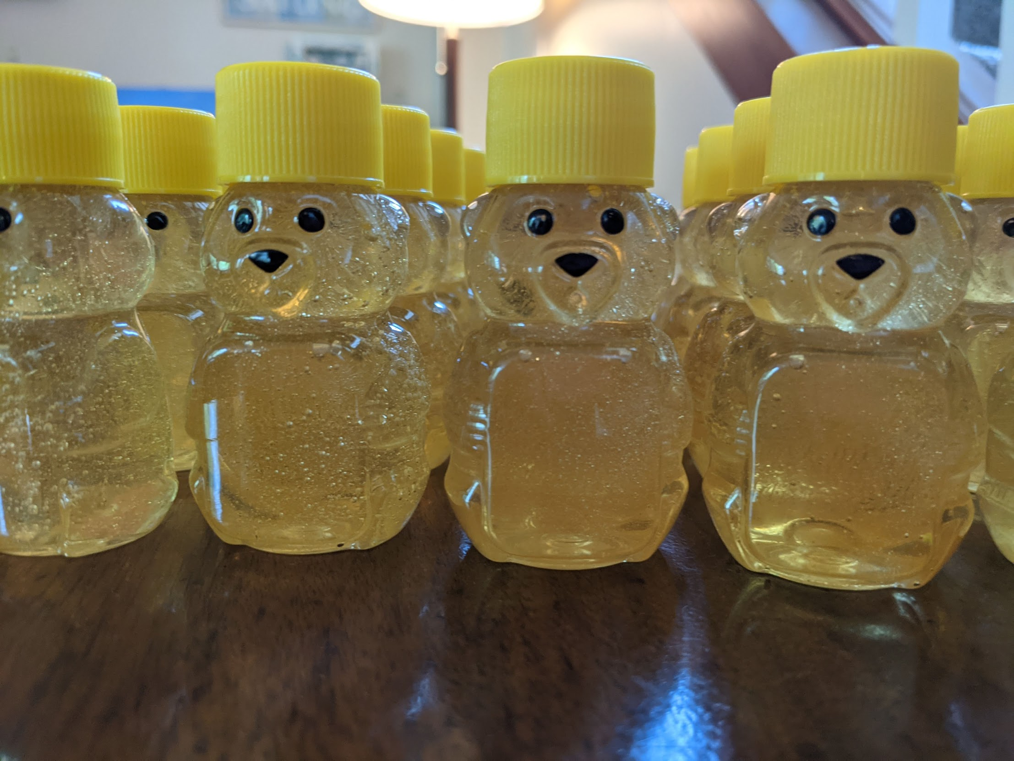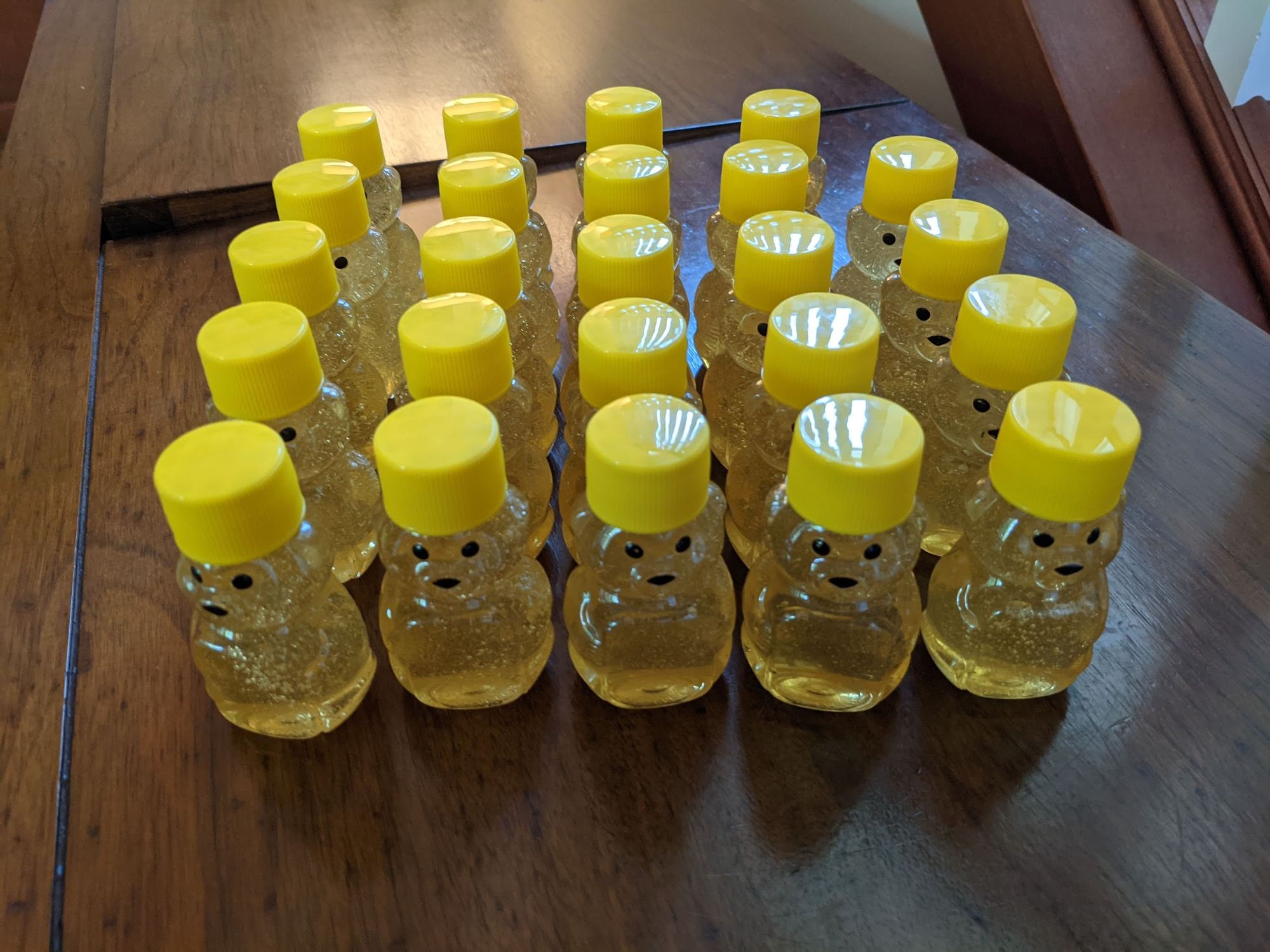 I didn't think we would have too much honey yet, so I bought small 2 oz jars to start. I filled 24 jars from the one frame of honey. It was a little difficult to get to this point, so Braden purchased some fancier equipment for next time.