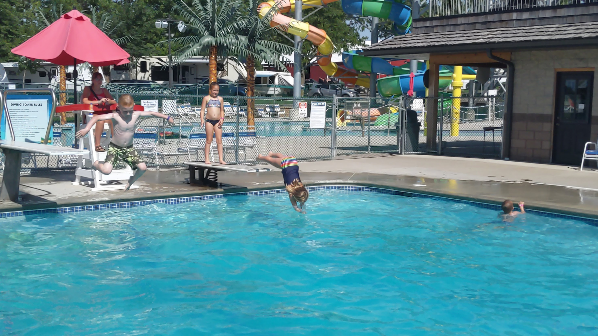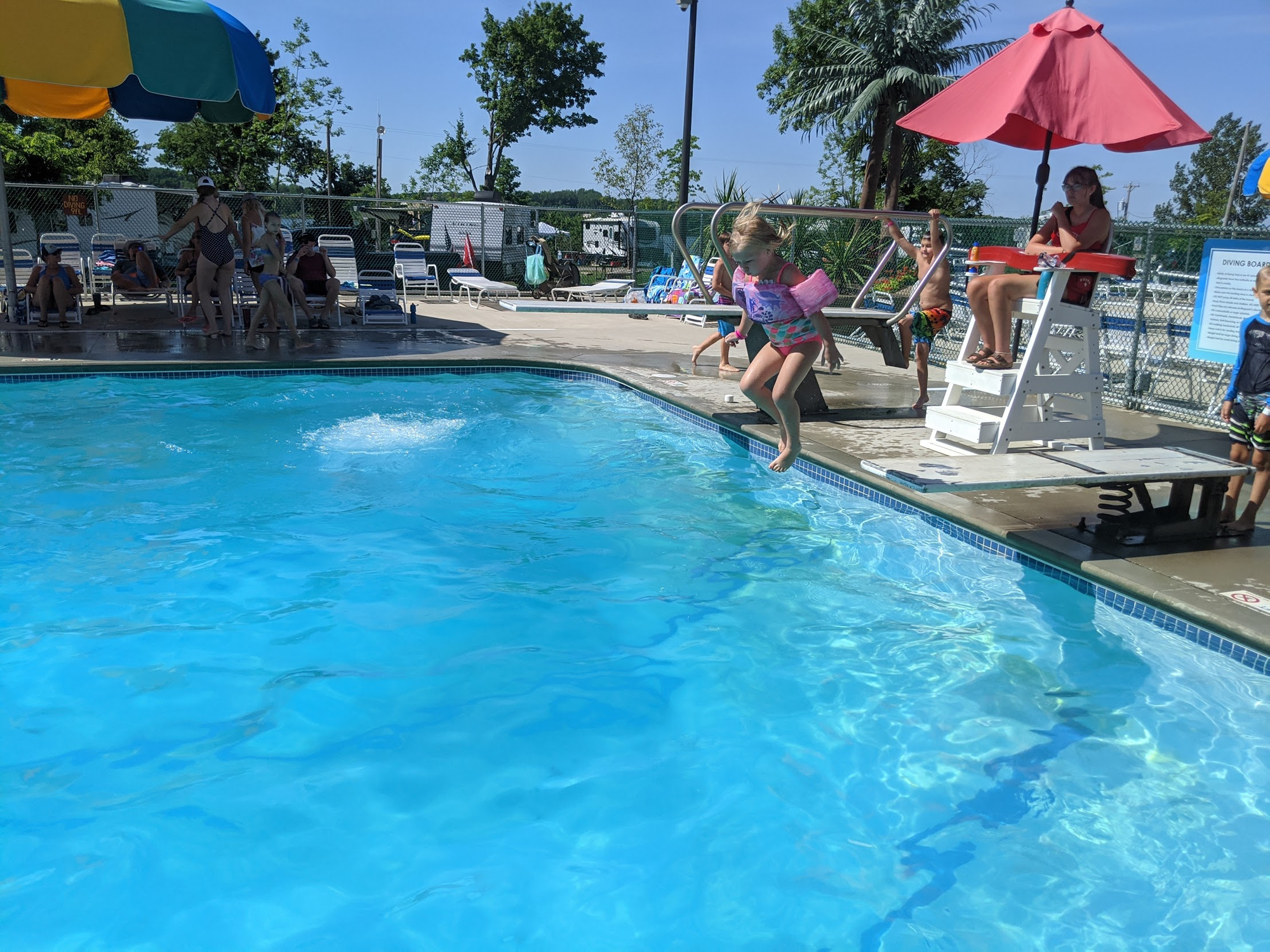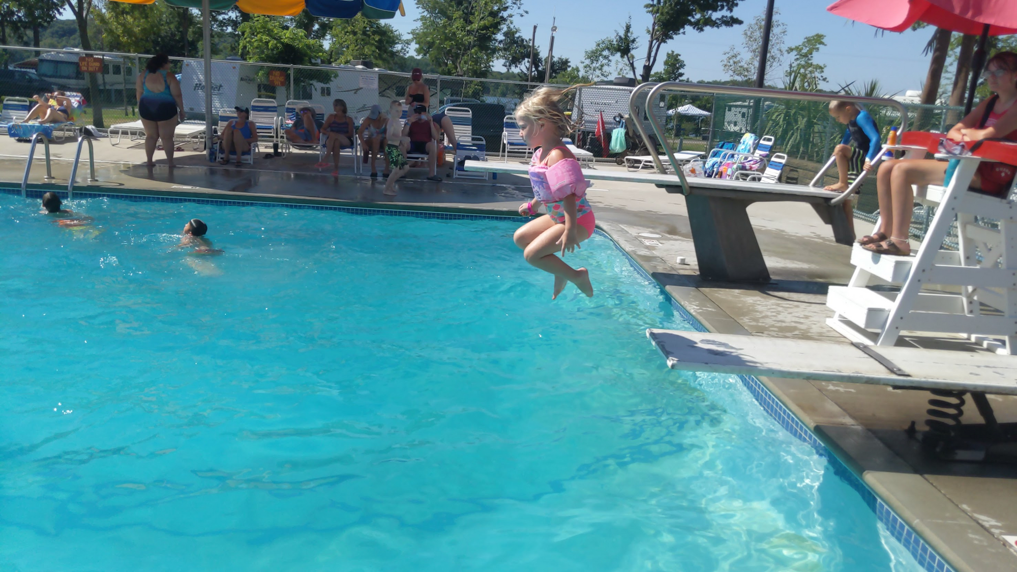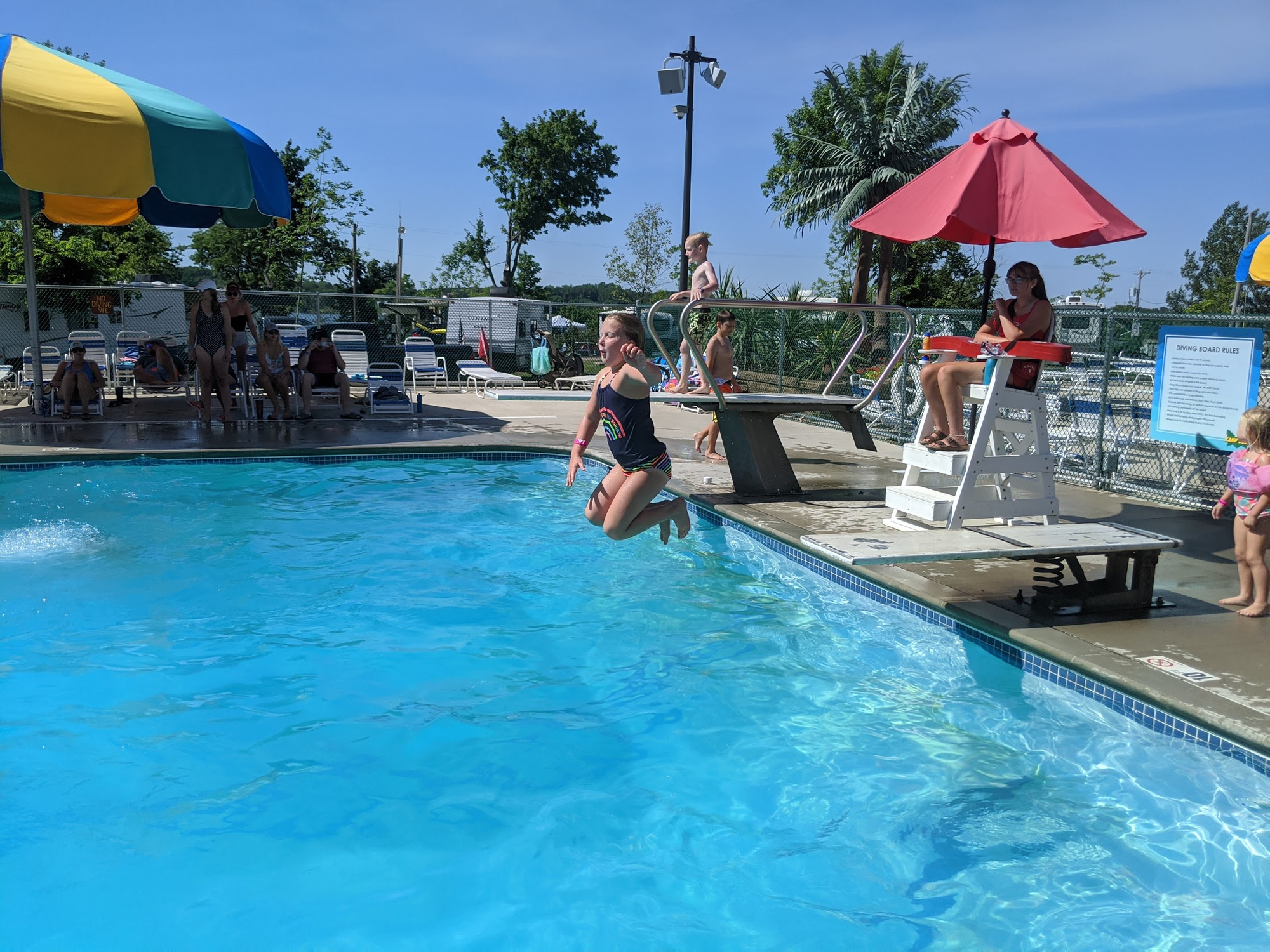 The rest of the day was spent at the pool. The diving board was very popular with both girls.