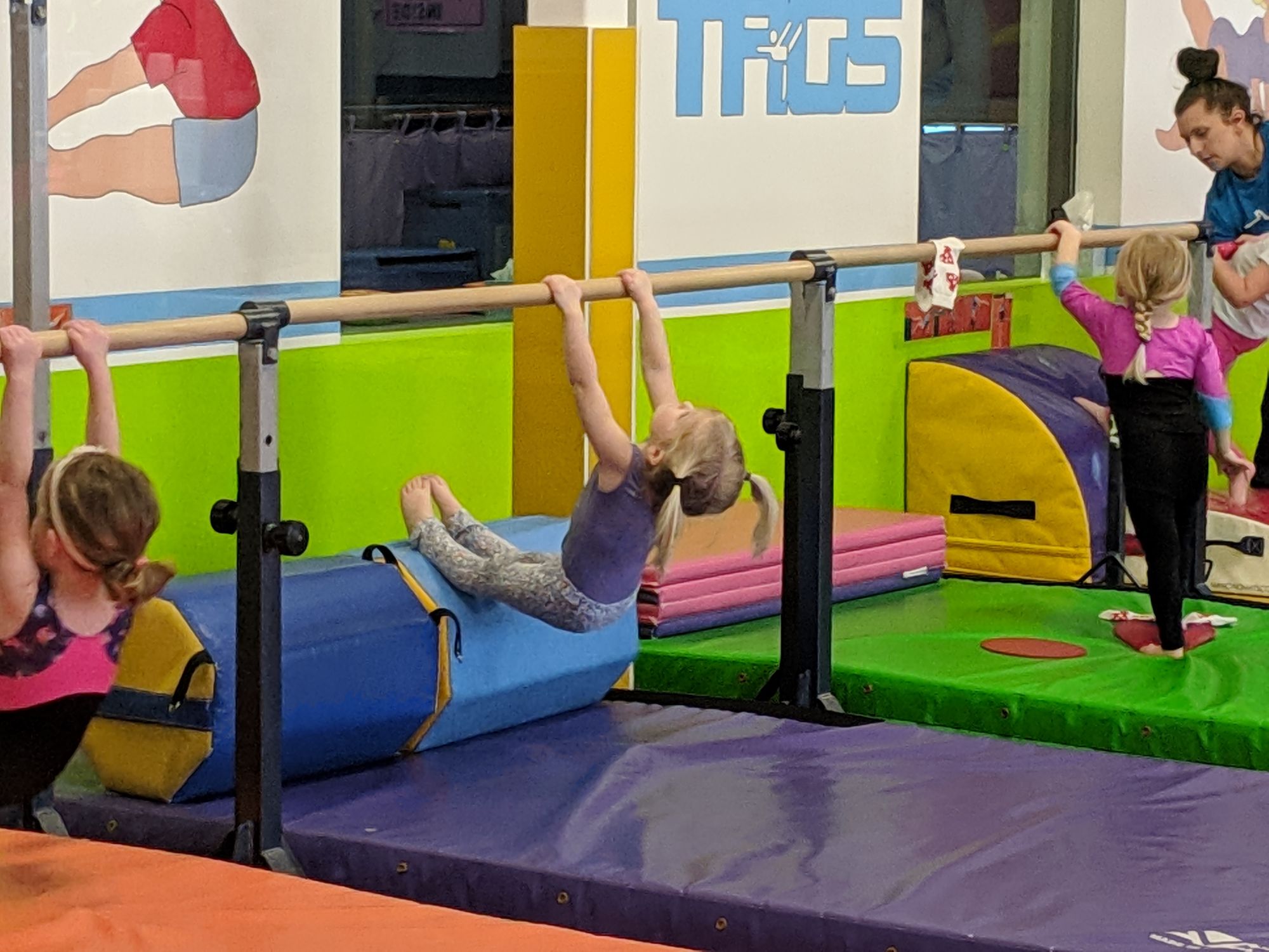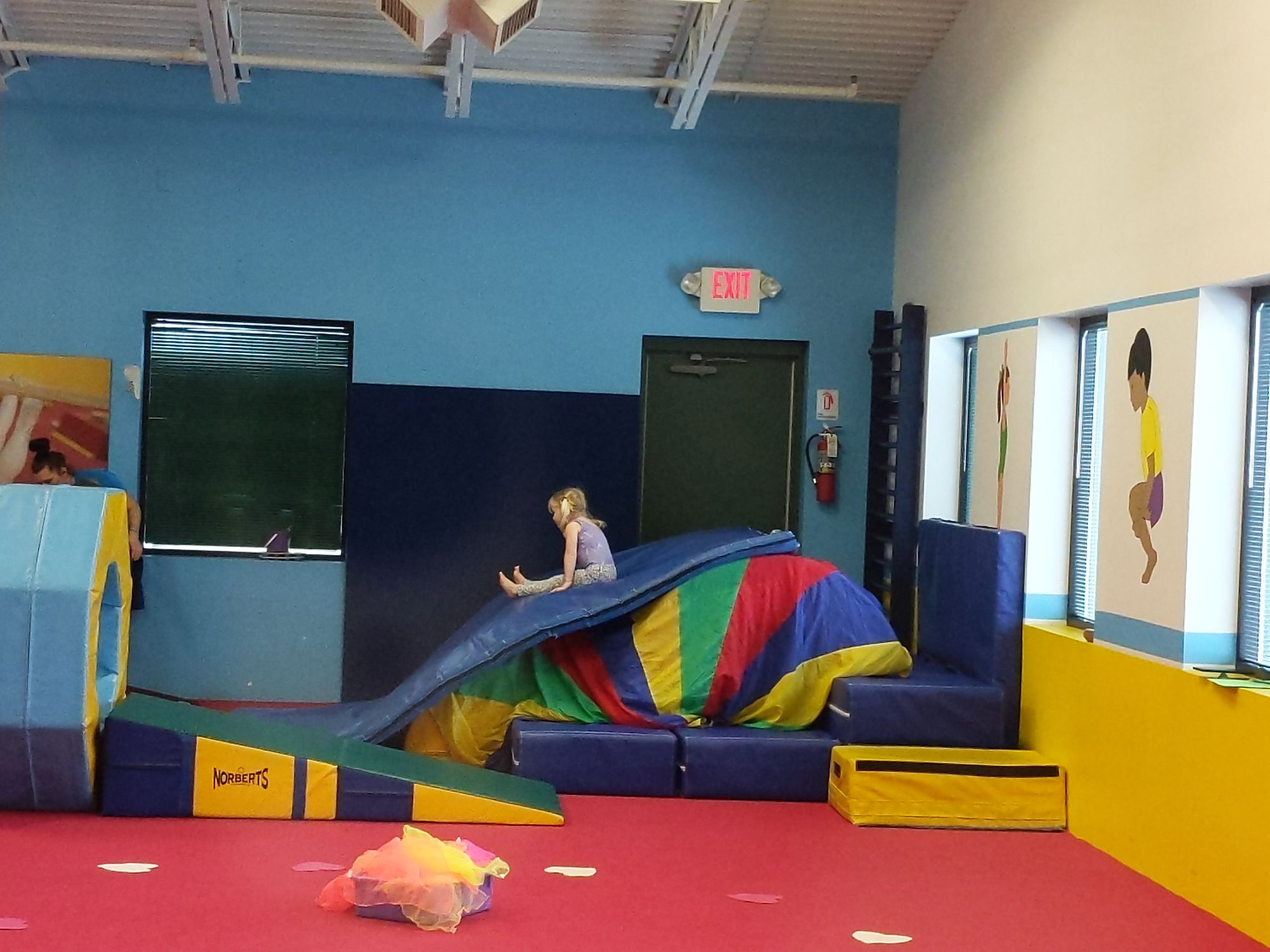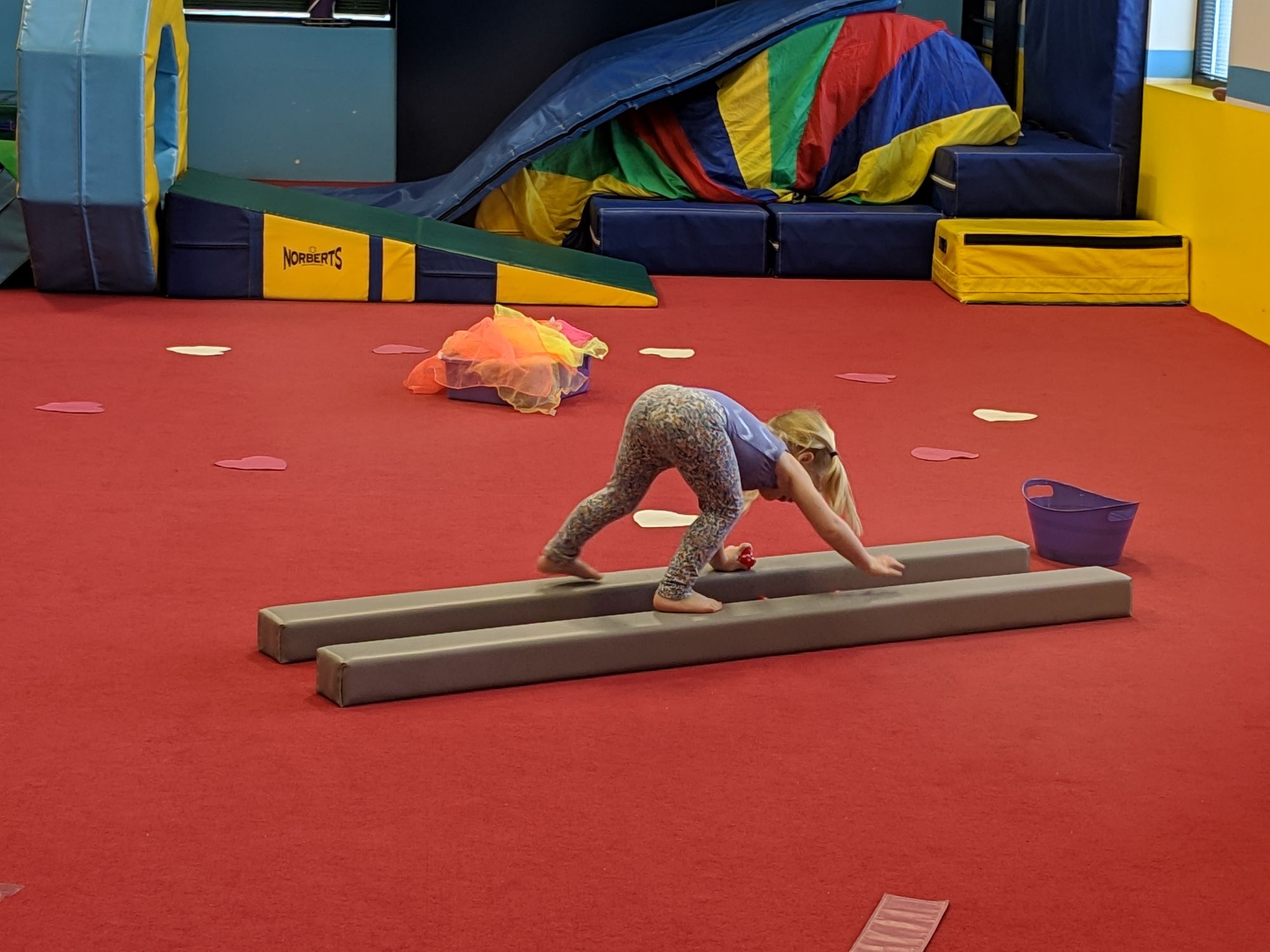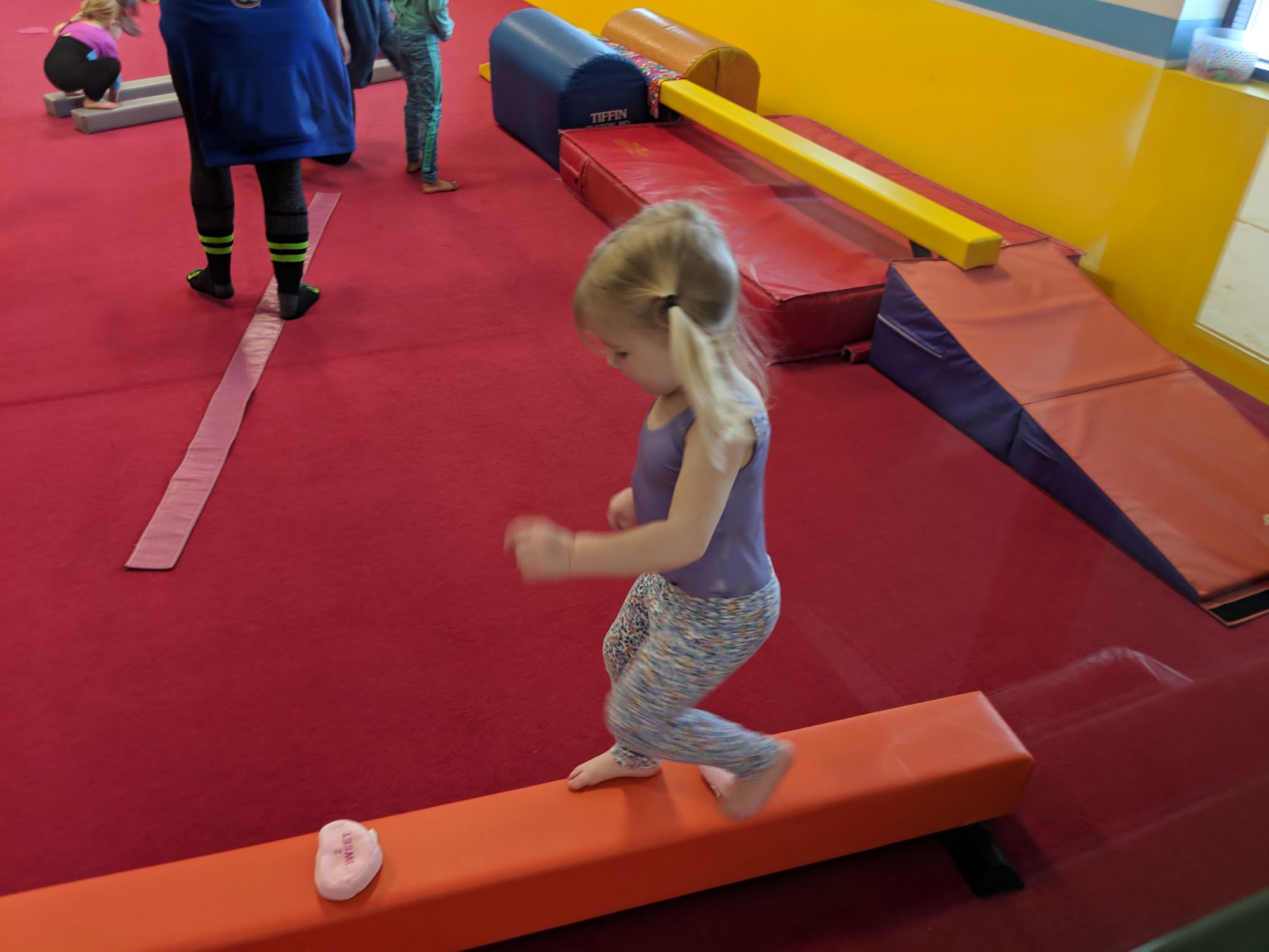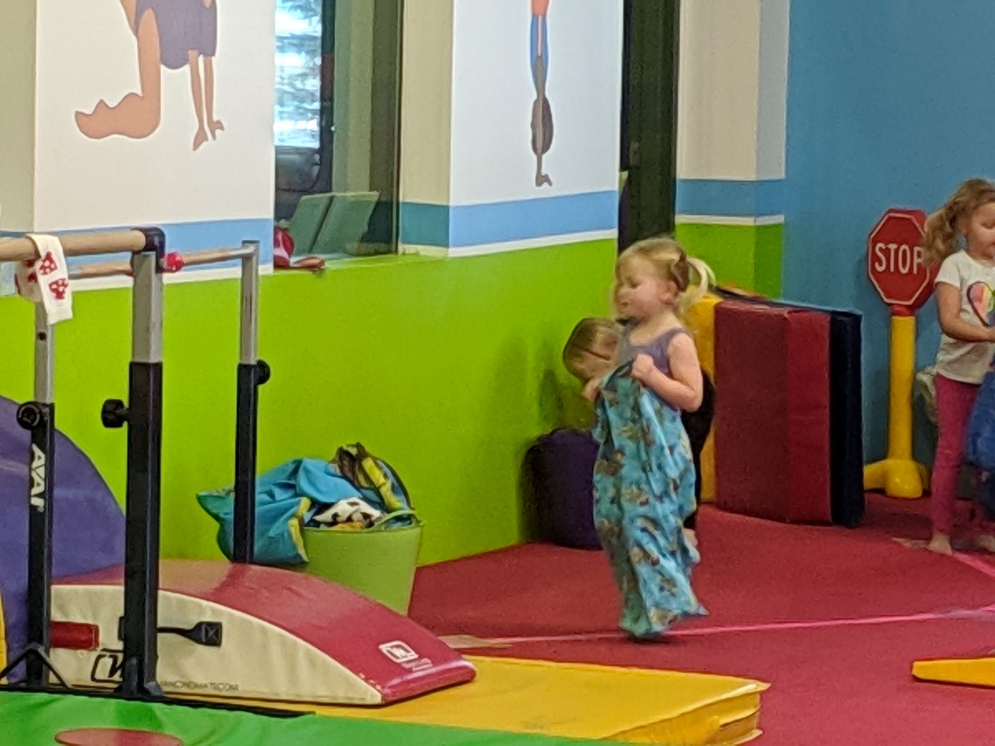 When we got to gymnastics they said Olivia was the only one for the 3s class, so she was going to get to do the 4s class. She was one excited girl... and she hung in there with all those 4 year olds! 💕