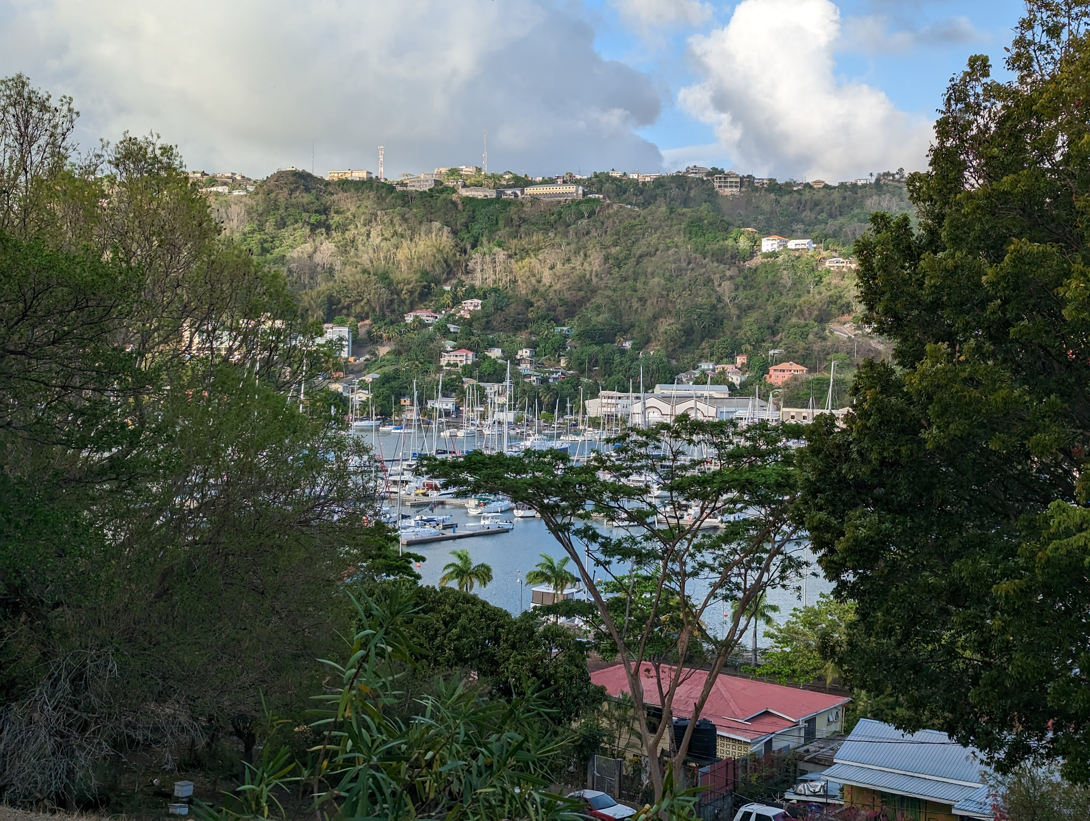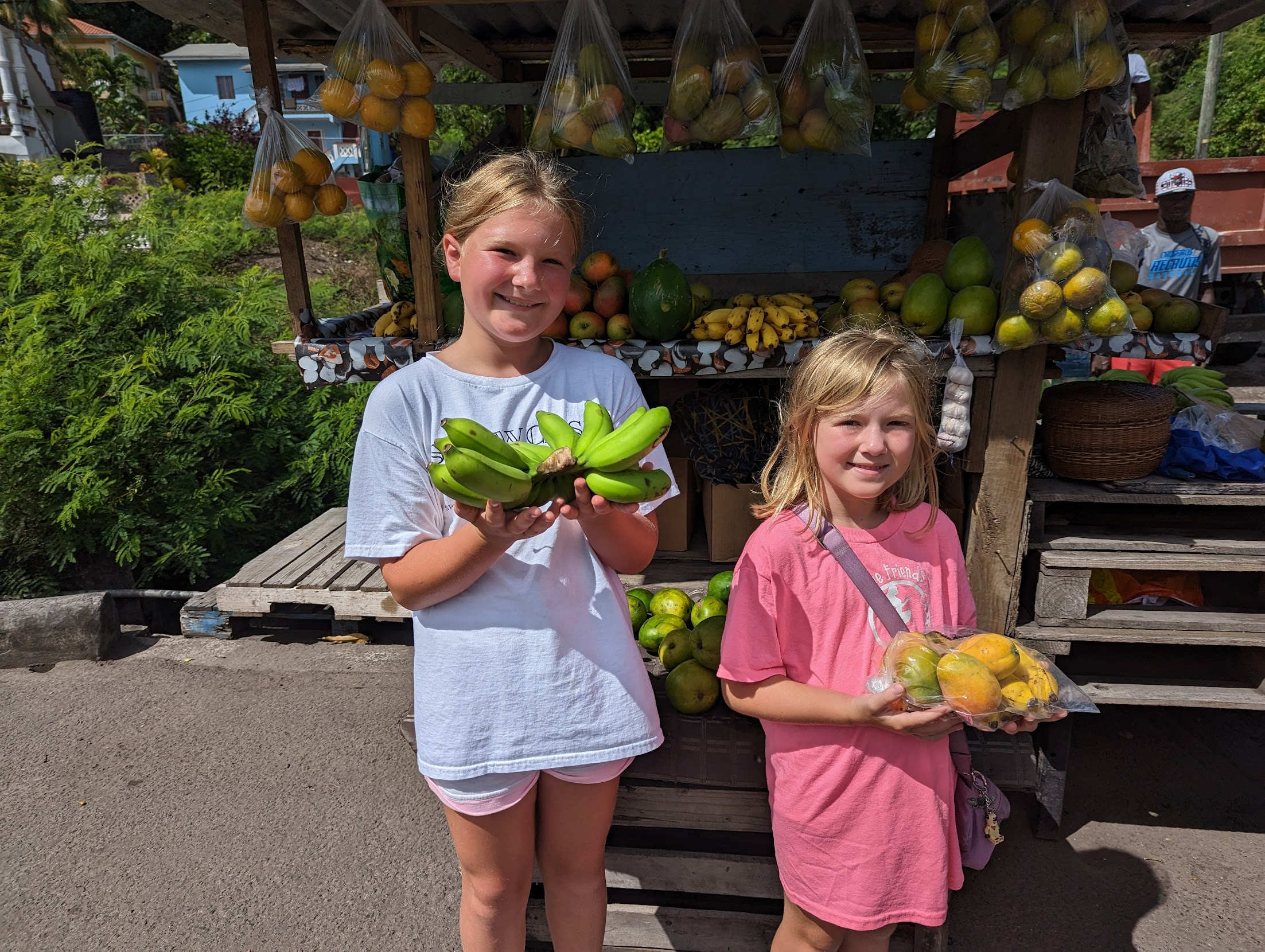 We've spent enough time in Grenada to have a list of our favorite places to go. Now that we're back we're visiting them one by one. First stop this morning... the fruit stand across the street from the marina. The couple that runs the stand literally stops traffic for us to cross the street. Our haul this morning were bananas and mangoes.