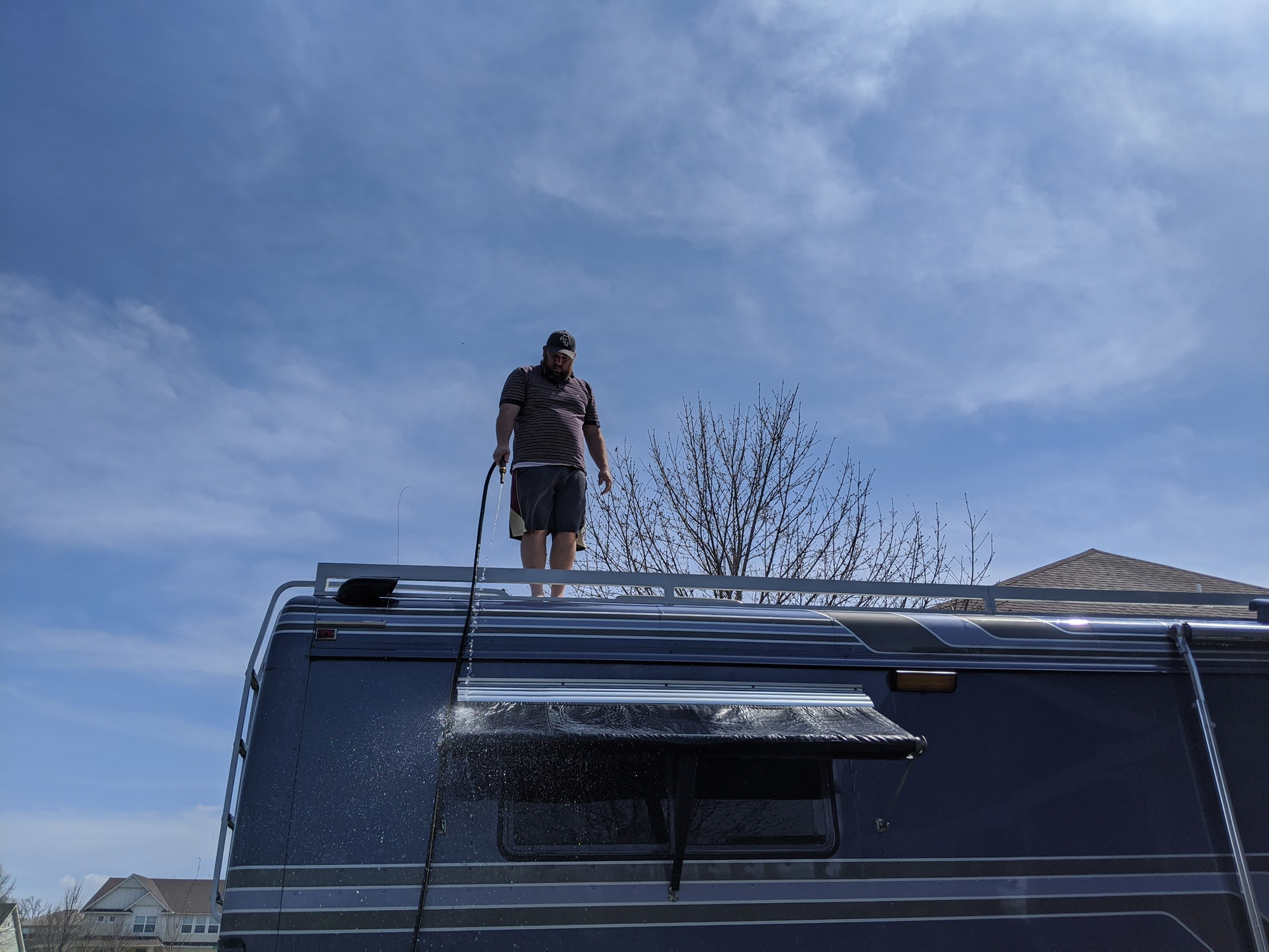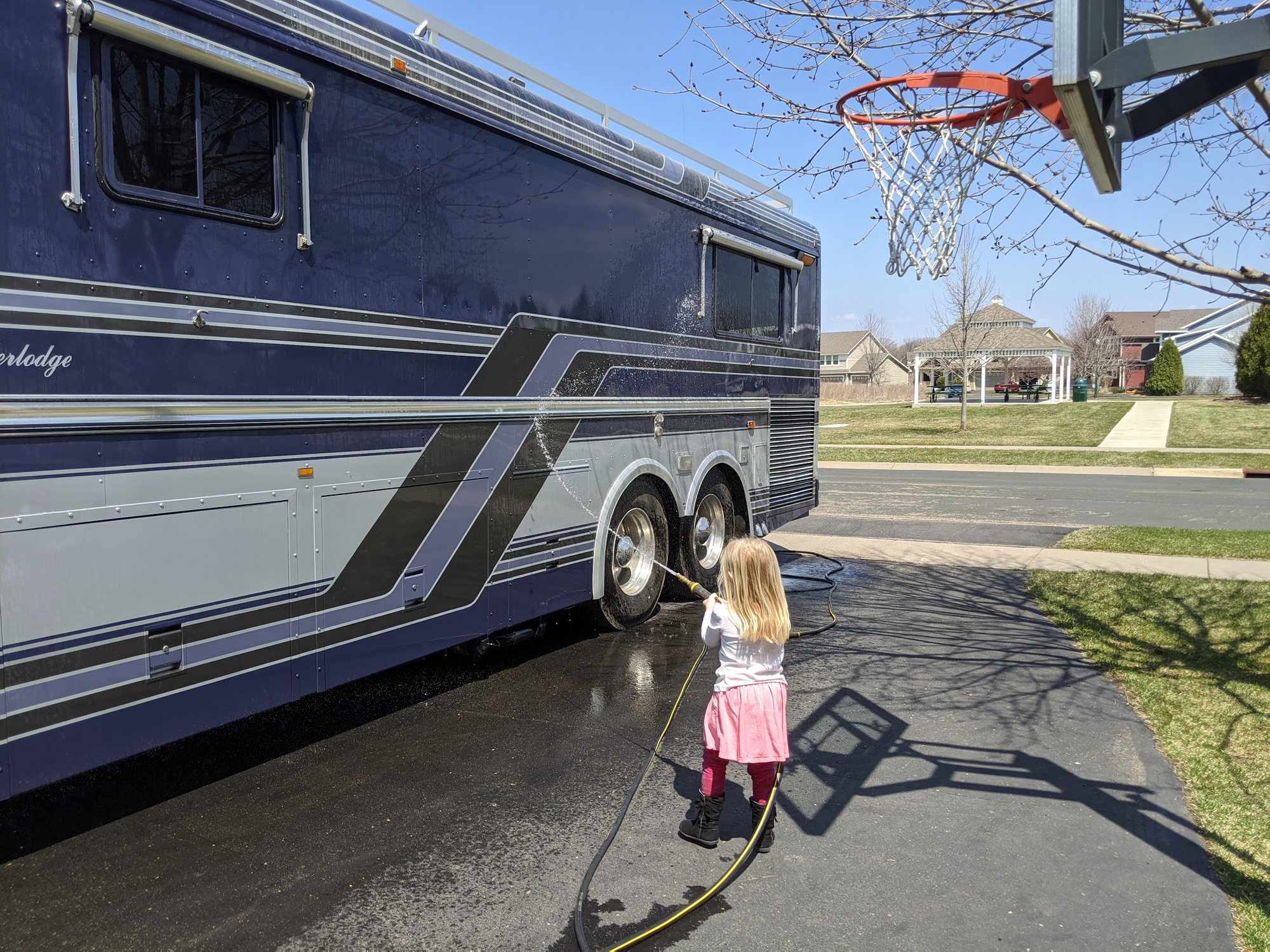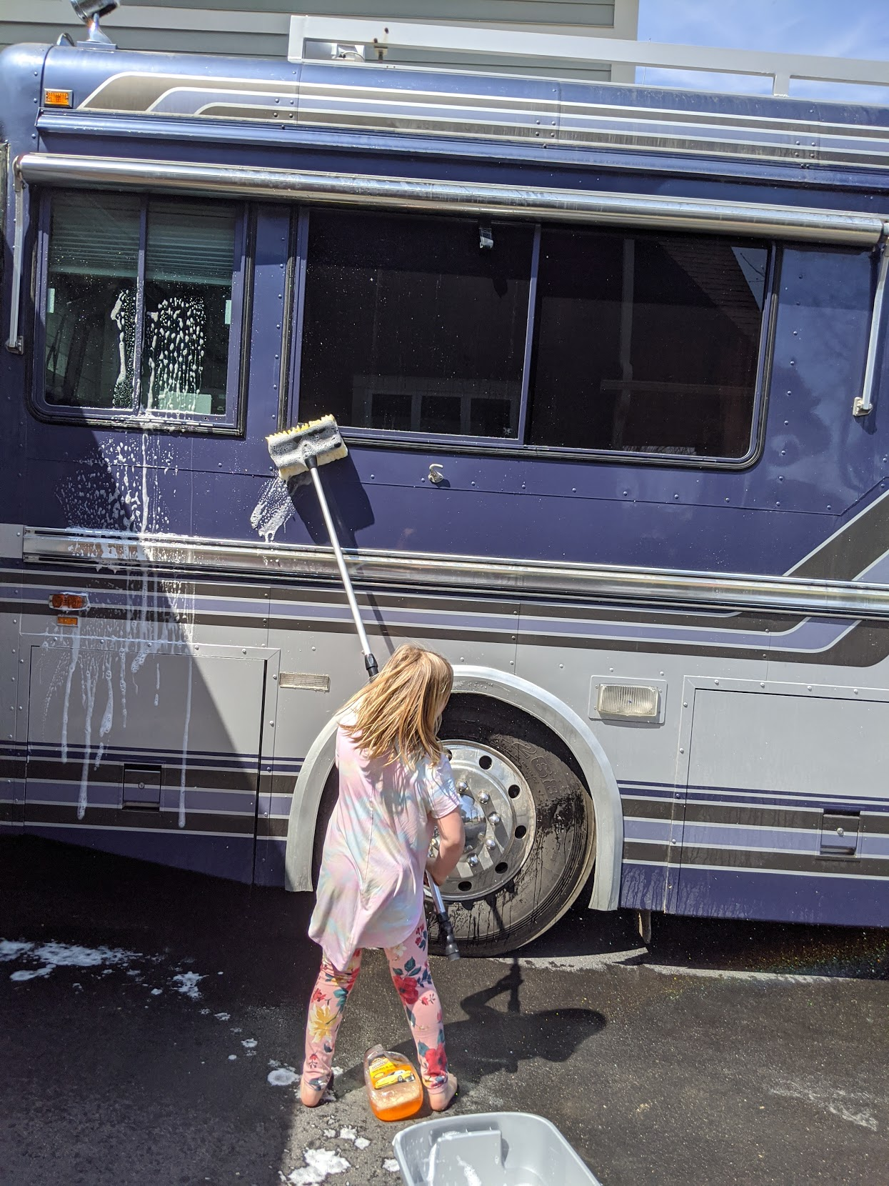 Today was a teacher learning day, so Emma didn't have any distance learning assignments. I didn't think we'd be doing anything outside since the forecast said it was going to rain most of the day. Turns out the forecast was completely wrong. We made use of the nice, warm day and washed our really dirty bus.
