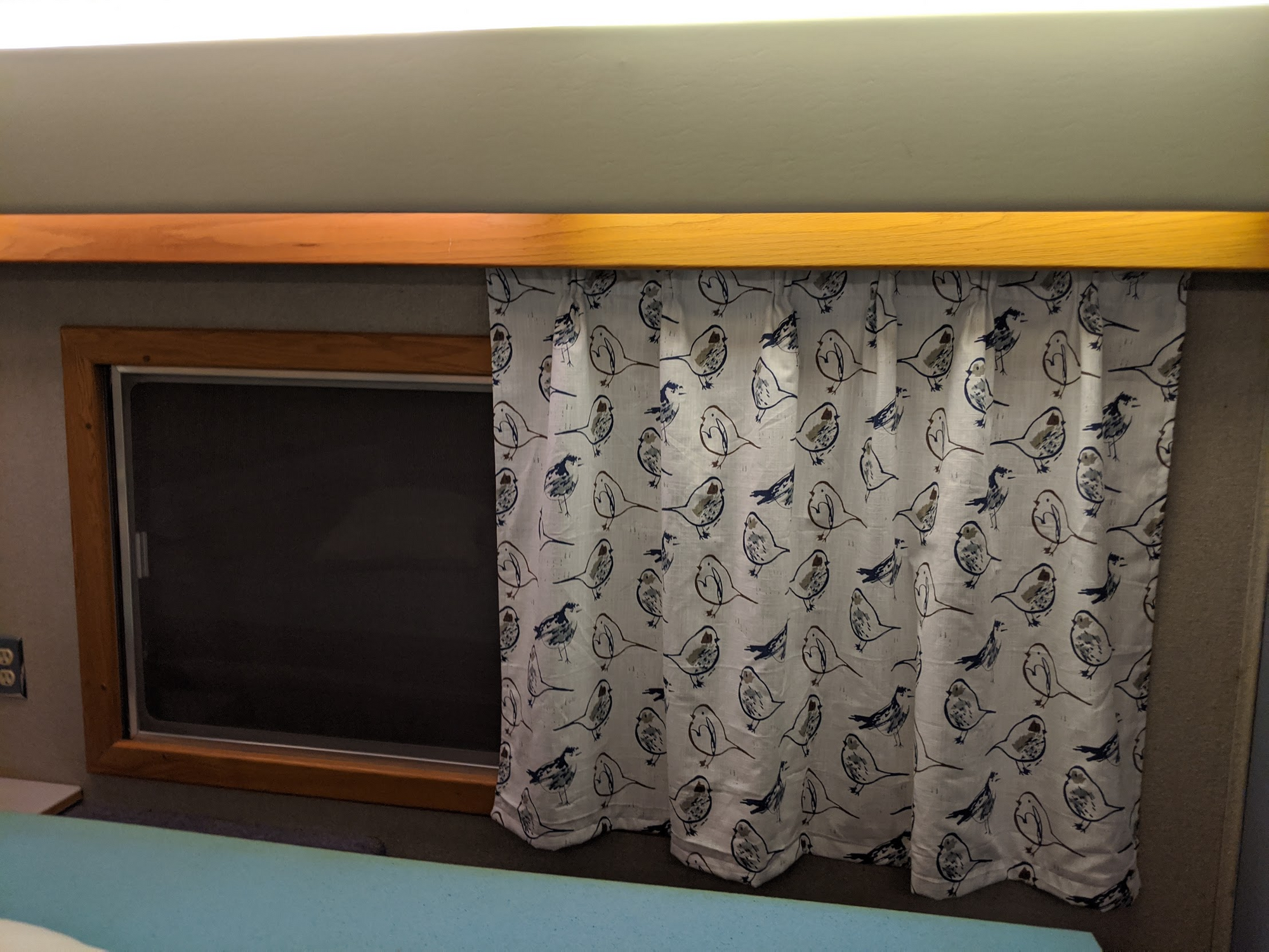 I've been wanting new curtains in the bus, but haven't been able to find any the right size, or kind, or fabric. I watched some YouTube videos and started making new ones for our bedroom with my new sewing machine. Now I just have 3 more panels to go!