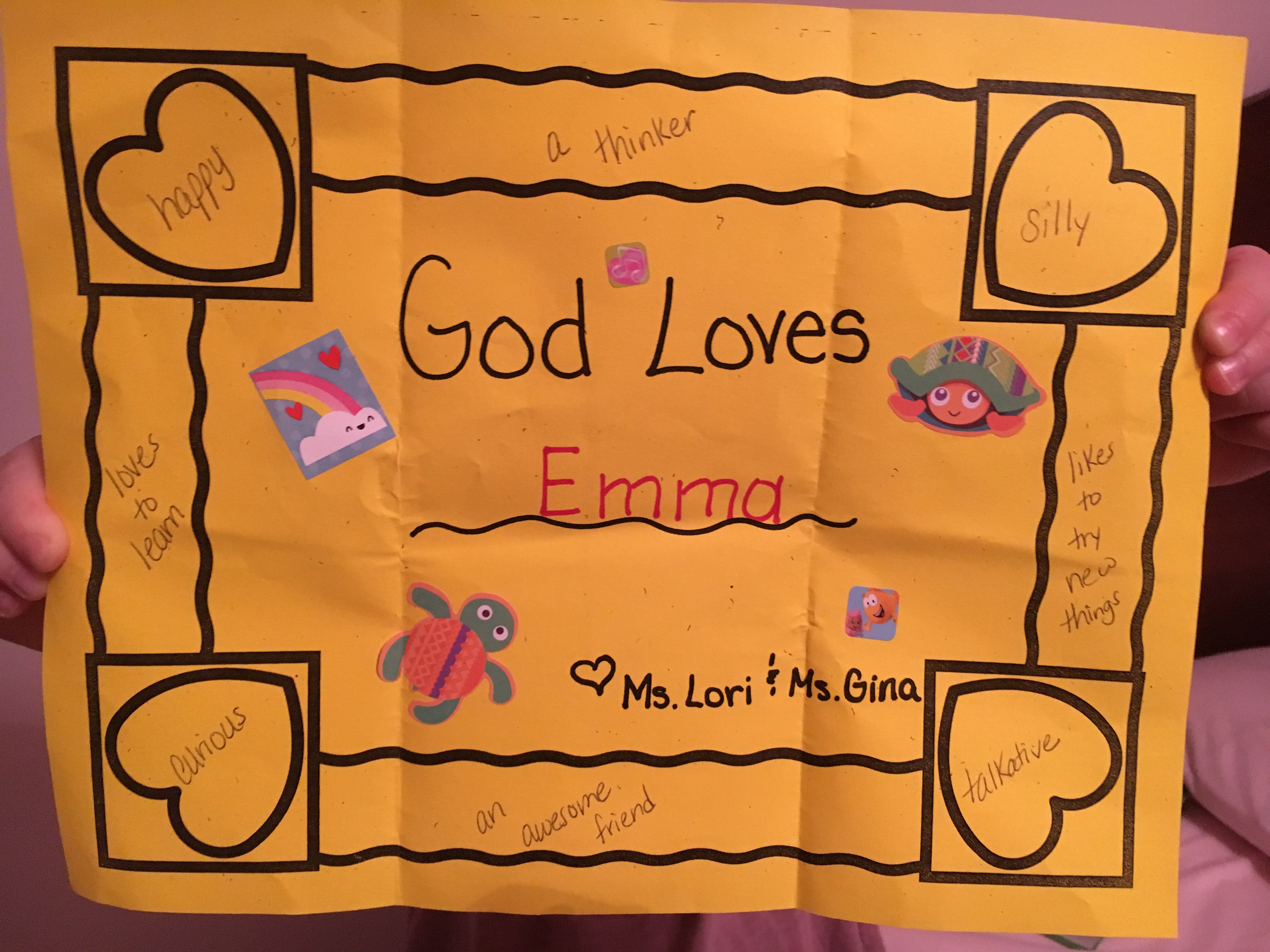 For letter G day at school her teachers asked for a self addressed envelope so they could send all the kids mail. Emma got hers yesterday. I loved reading all the things they wrote about her… and was not surprised talkative was one of them. That girl can talk!