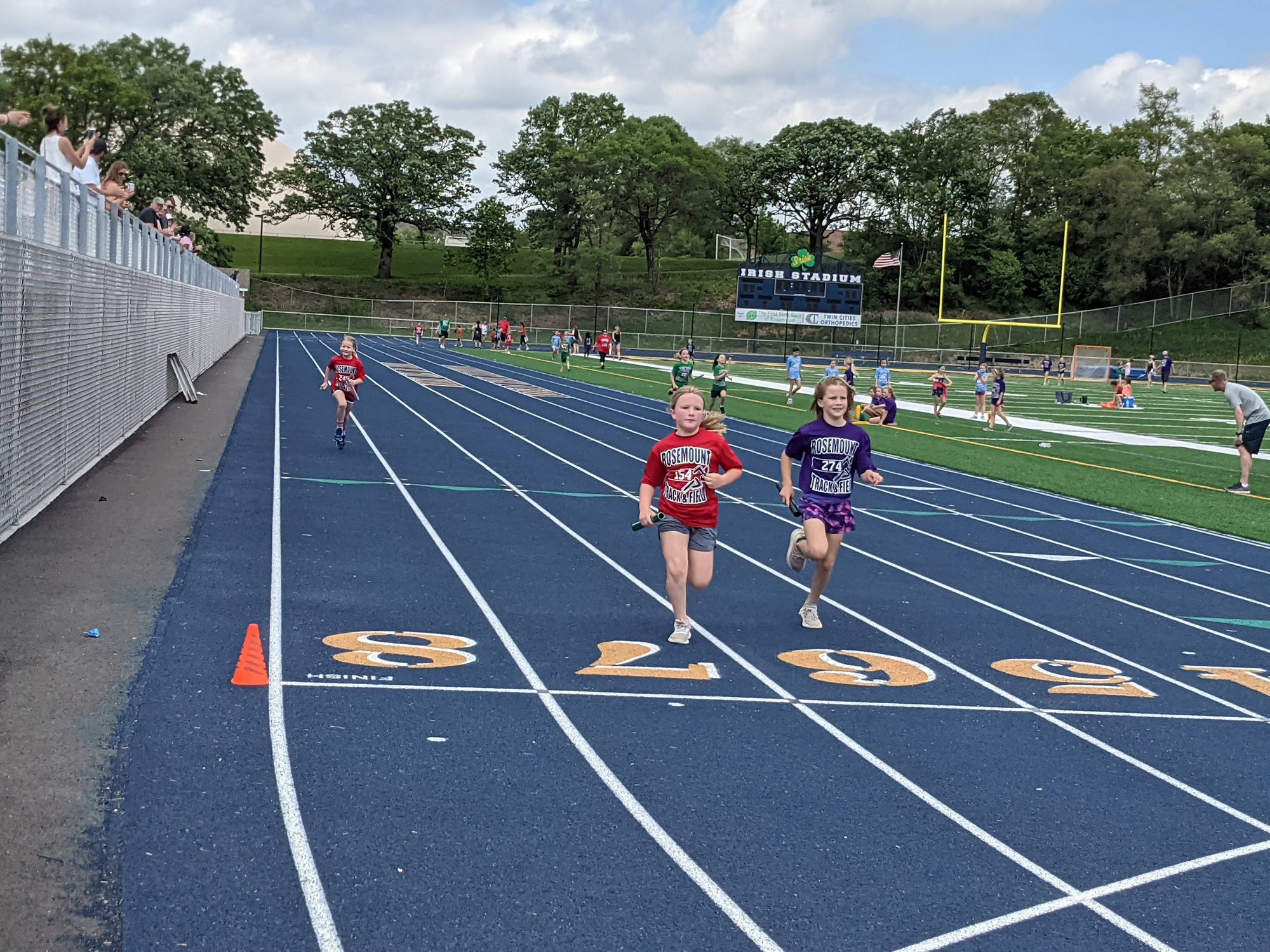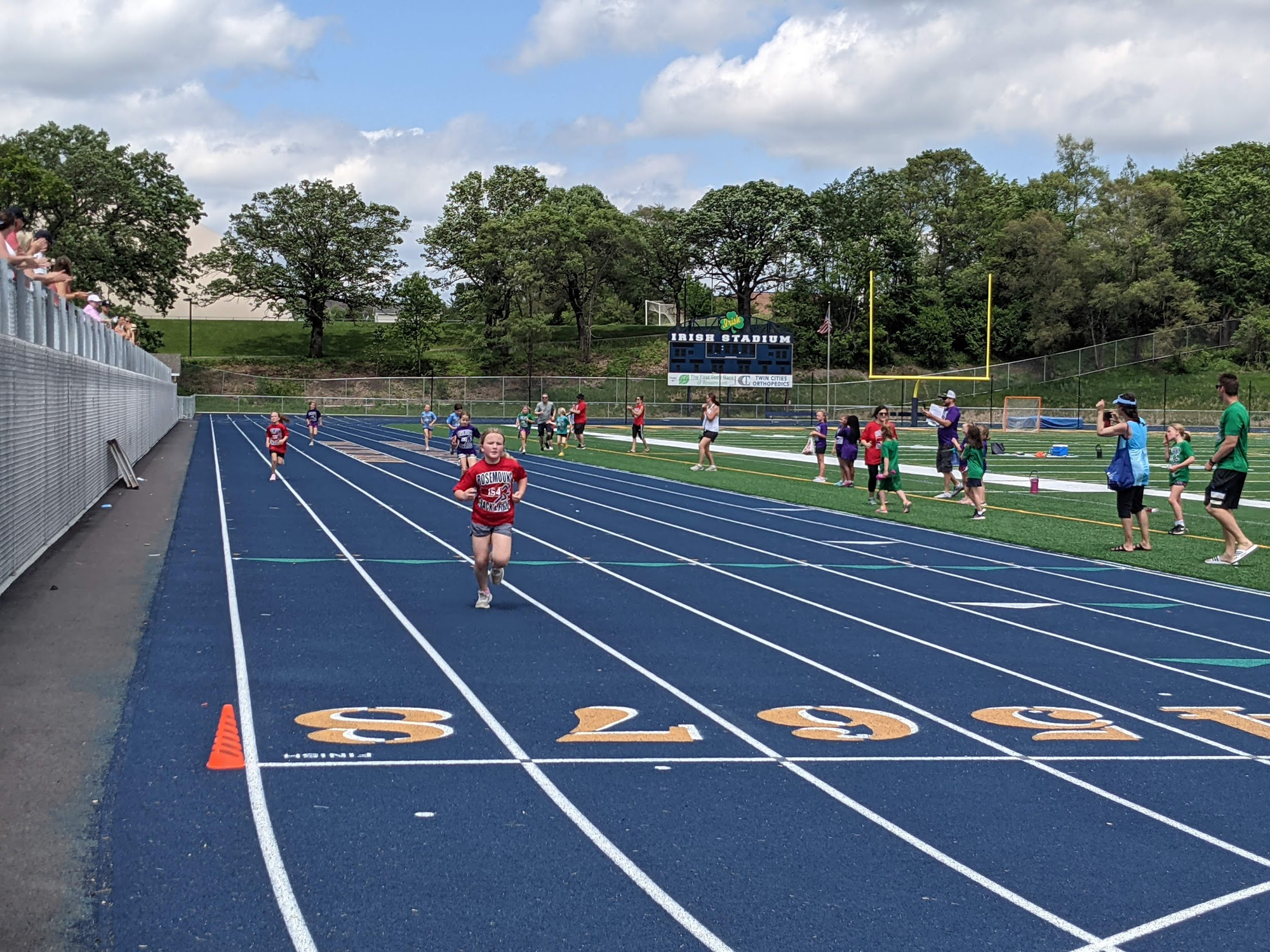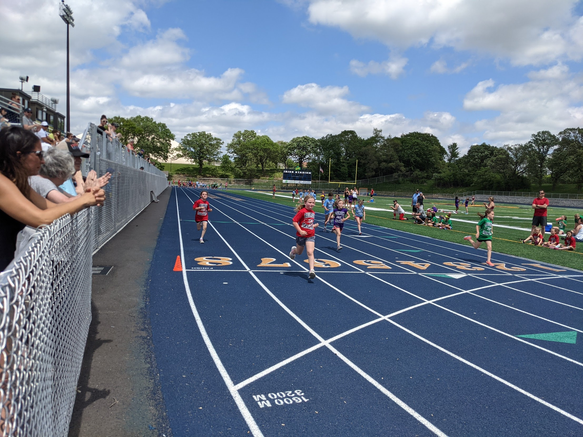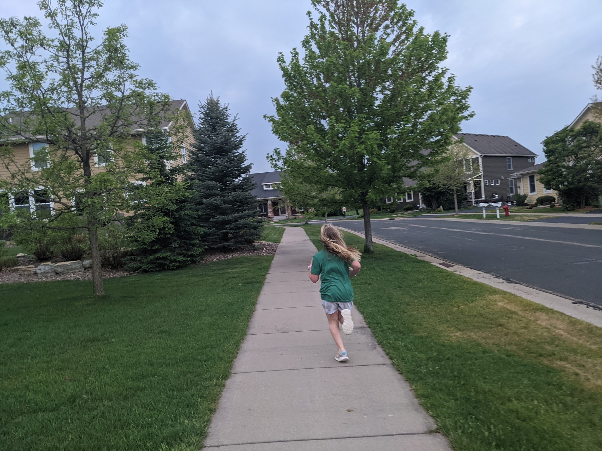 She ran the 400 meter (1 lap around the track) in the very first track meet. She hated it. Last week she said she would try it again for the last meet. I walked our block and figured out how far she would have to run to get to 400 meters.... then we practiced. The first practice lap didn't go so well...