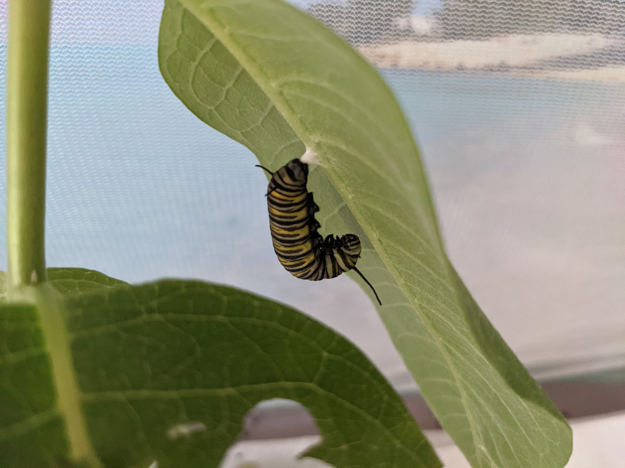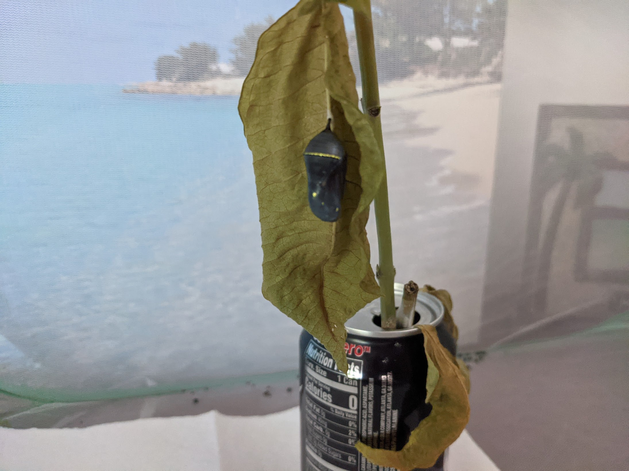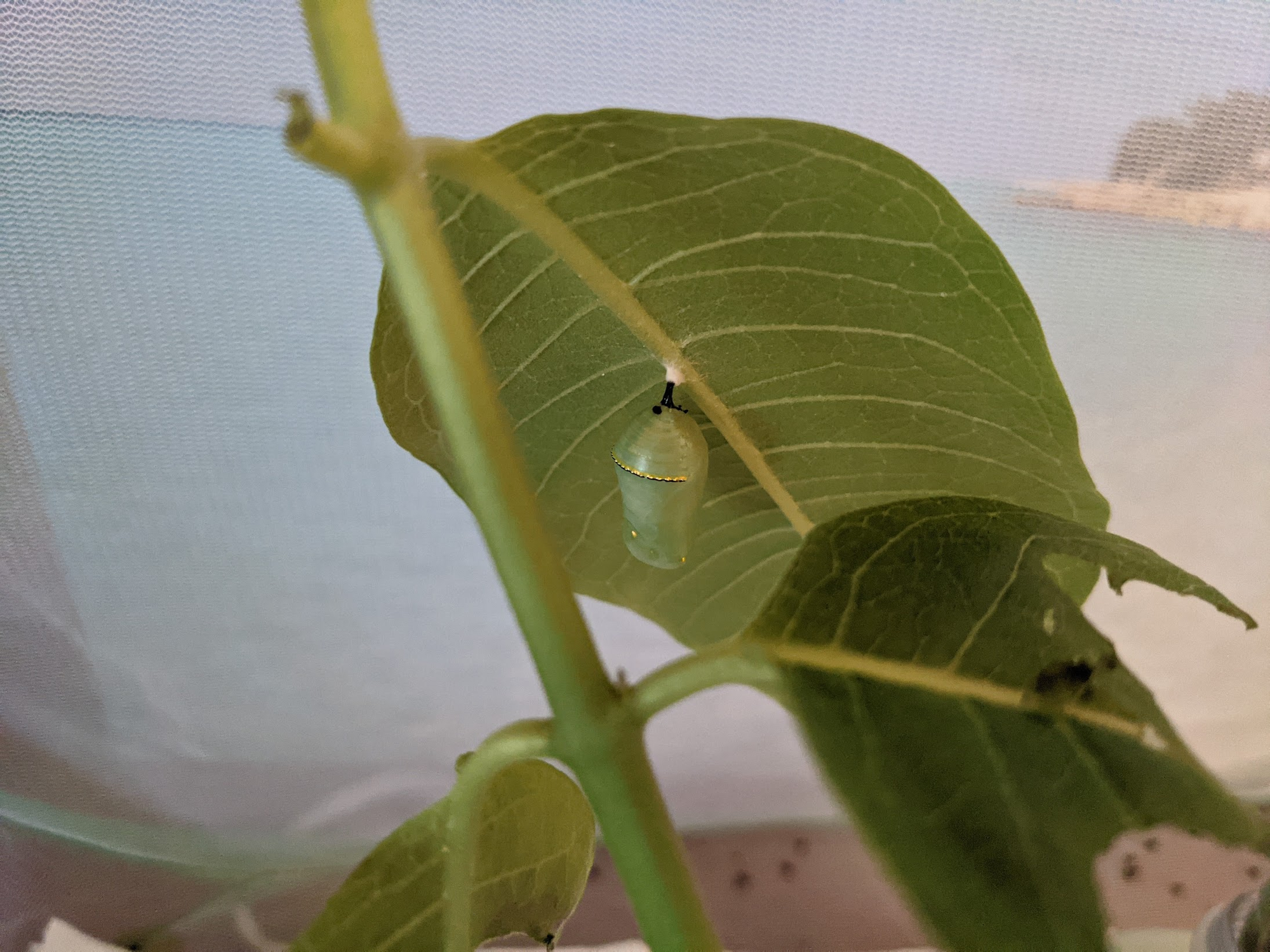 Yesterday morning they checked and the chrysalis was black, which means it would be hatching any day.