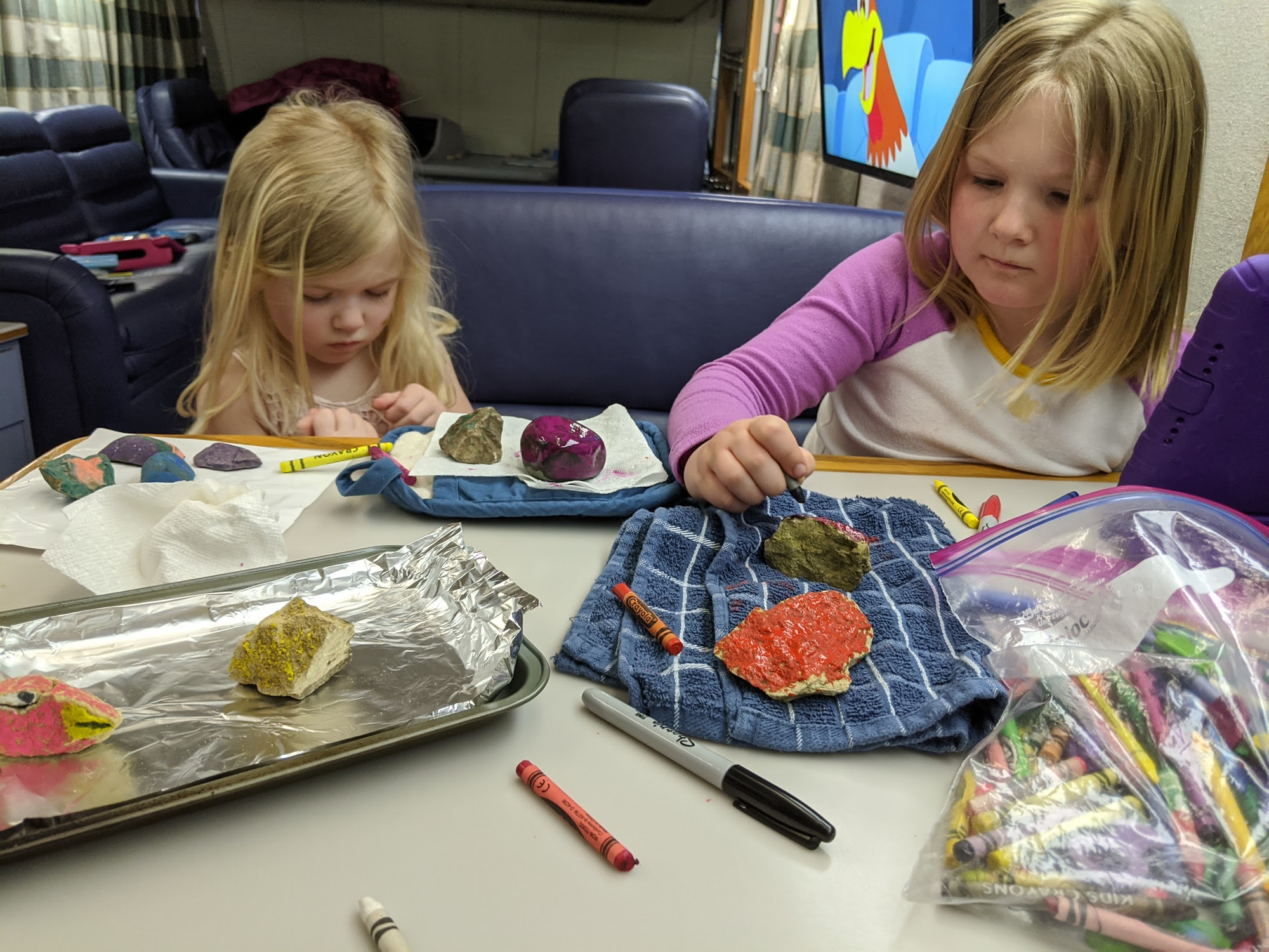 We worked on some more rocks to put out for kids to find. This time instead of paint I put the rocks in the oven for 30 minutes and we used crayons to decorate them. The rocks don't get hot, but they're warm enough to melt the crayons. Someone suggested students leaving a rock at school with their teacher's name on it. Emma made one for her teacher and we'll go by this week and drop it off.