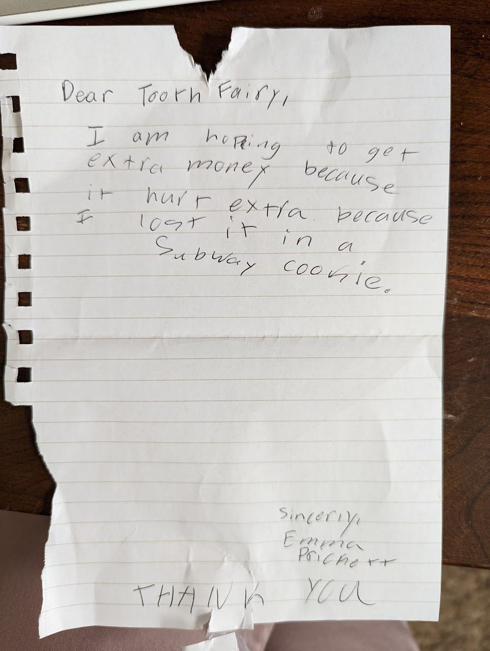At Christmas she told me she knew the tooth fairy (and Santa) aren't real, but she knows she's not allowed to say a word to Olivia. She went up to her room and came down a few minutes later with this note. Turns out it was her lucky day because all the tooth fairy had was a $5 bill.